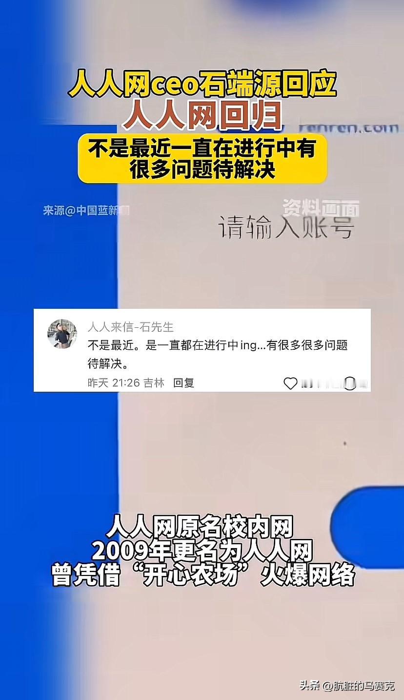 知道人人网的都四十多岁了吧? 和前任已经14年没有联系了,早已一别两宽,心如止水,没有QQ 没有电话。 万一人人网恢复了发现还是互关好友,我忍不住去联系怎么办? 想当年一到一些节日或者纪念日,人人网的主页logo都会相应的变化,这个应该是目前其余社交软件没有做到的。数据即使恢复回来了 我的手机号邮箱也回不来了。即使手机号邮箱也回来了。我的青春再也无法恢复回来了。