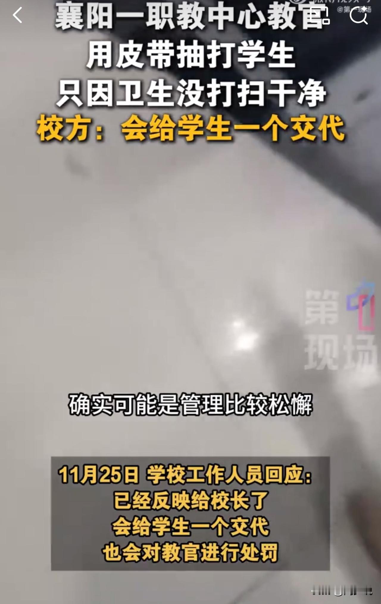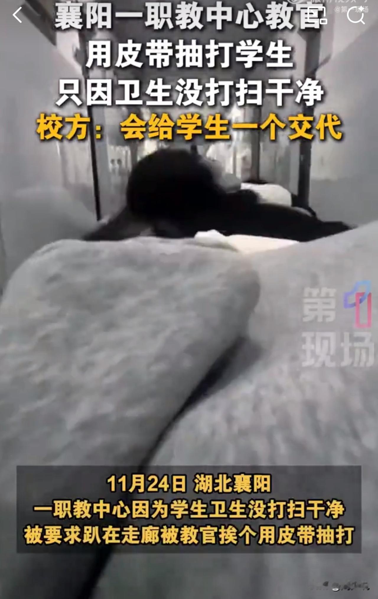 #MCN双量进阶计划#“这教官太粗暴了!”近日,湖北襄阳一职教中心被爆多名学生因卫生未达标,被要求趴在走廊,教官竟拿皮带挨个抽打,现场画面引众怒。 视频曝光后,引发众多网友热议。有网友说:“卫生没做好顶多罚打扫,皮带抽打也太过分了,这是体罚不是管教!” 也有网友指责:“教官没资格动手,学校监管去哪了?必须严查!” 还有网友更是坦言:“心疼学生,这样的教育方式只会留下心理阴影!” 目前,学校回应已上报校长,会给学生交代并处罚教官。 看完这事,周少想说本该守护校园秩序的教官,却用暴力对待学生,卫生问题可批评教育,动手打人绝非合理方式,既伤学生身心,也违背教育初衷。 再者,校园管理需守底线,暴力从不是解决问题的办法。教官的行为突破教育伦理,校方不仅要处罚当事人,更该完善管理机制,杜绝此类体罚事件,真正守护学生的身心健康,这才是教育该有的温度。#寻美三湘# #长沙新朋友#