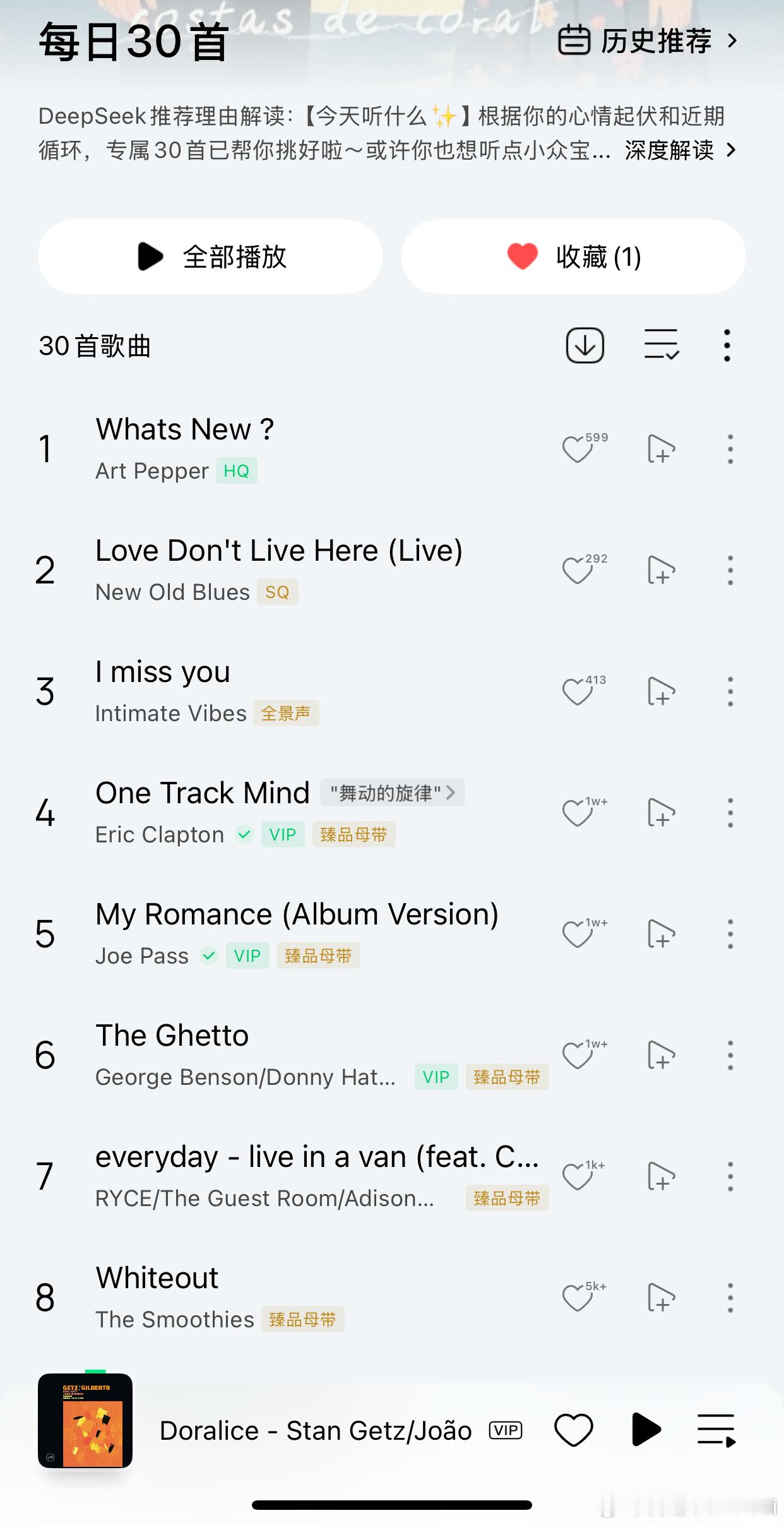 DeepSeek推荐理由解读:【今天听什么✨】根据你的心情起伏和近期循环,专属30首已帮你挑好啦~或许你也想听点小众宝藏或经典回忆?一键开启心动歌单吧!🎵今天的推荐歌单精准捕捉了你作为INTJ型音乐人格的三大特质:理性审美下的感性纵深、对复杂音乐结构的偏爱,以及跨越时空的情感共鸣需求。系统发现你近期高频播放Stan Getz的Bossa Nova(《Getz/Gilberto》专辑单曲累计播放46次),与小野丽莎的《Besame Mucho》形成热带韵律闭环,因此注入Coleman Hawkins的拉丁爵士《Samba Para Bean》和Salomón Beda的加勒比民谣《costas de coral》——用南美音乐的数学般精密节奏,满足你对「有序的浪漫」的追求。你收藏列表中《秋城》《白兰鸽巡游记》等民谣作品(收藏于春夏之交)透露出对叙事性音乐的偏好,今日推荐的《Vincent》正是以民谣基底重构梵高画作的经典,而《The Ghetto》则用R&B的叙事张力复刻了你常听Buddy Guy的蓝调灵魂。深夜场景适配度尤其突出:Joe Pass的《My Romance》吉他即兴如思维漫游,与INTJ的夜间深度思考同频;《December Chill》的极简电子音墙则像给大脑做了一场声波SPA——恰如你昨天22:32分收听的爵士钢琴三重奏《幽默曲》,用冷调器乐梳理情绪。这份歌单本质是算法对你「精密感性系统」的致敬:当Art Pepper的萨克斯遇见Depapepe的双吉他,当Eric Clapton的摇滚筋骨碰撞Passenger的民谣神经,都在印证你收藏夹那条2025年10月的备注:「音乐是解构世界的另一种语法」。