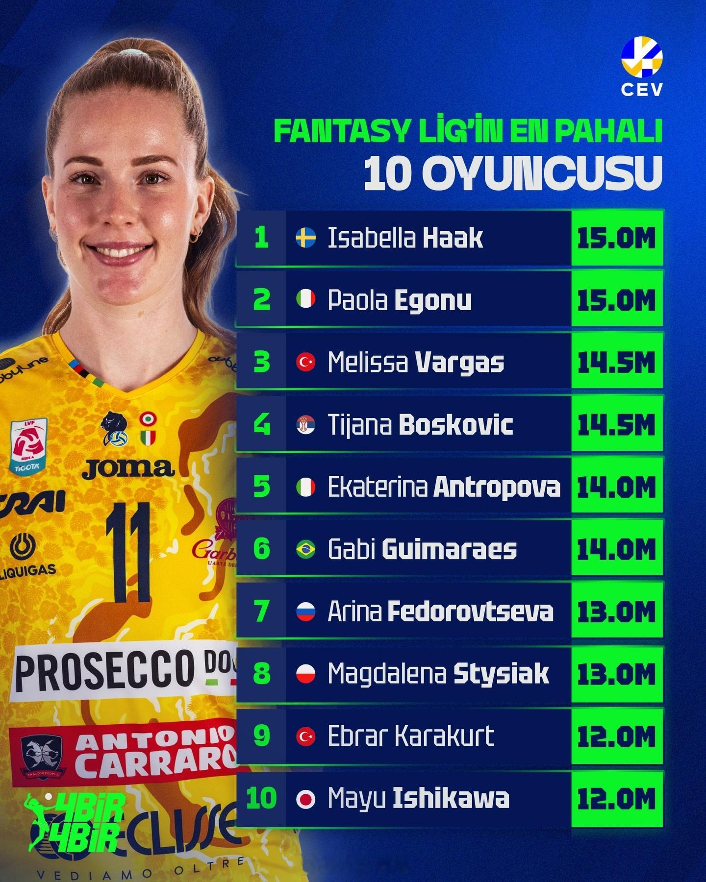 女排欧冠球迷梦幻游戏中目前“身价”排名前十的运动员。