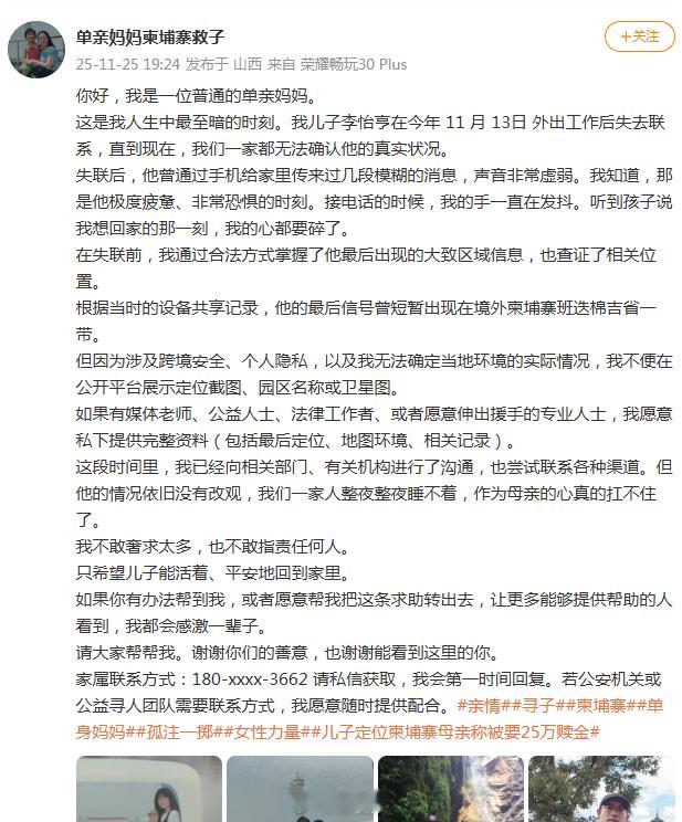 【】11月25日,演员 发布一条求助信息,称与其一起长大的表弟在11月13日外出工作后失去联系,其家人在通过各种方式在找人,并附带了弟弟母亲 发布的详细求助信息。据 发布的信息显示,其儿子李怡亨最后信号曾短暂出现在境外柬埔寨班迭棉吉省一带,“失联后,他曾通过手机给家里传来过几段模糊的消息,声音非常虚弱。”“直到现在,我们一家都无法确认他的真实状况。”