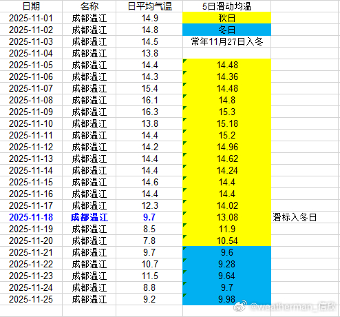 【成都温江入冬】按照滑标,成都温江站确定11月17日入冬,较常年提前10天。今天是判定日,今天的均温为9.2℃,使得第5组的5天均温,刚好卡在9.98℃。倘若今天平均气温再高0.1℃,入冬就失败了。这相当于篮球比赛打到最后1秒,冬天领先秋天1分,秋天上篮出手被冬天给大帽扇飞了,冬天险胜。