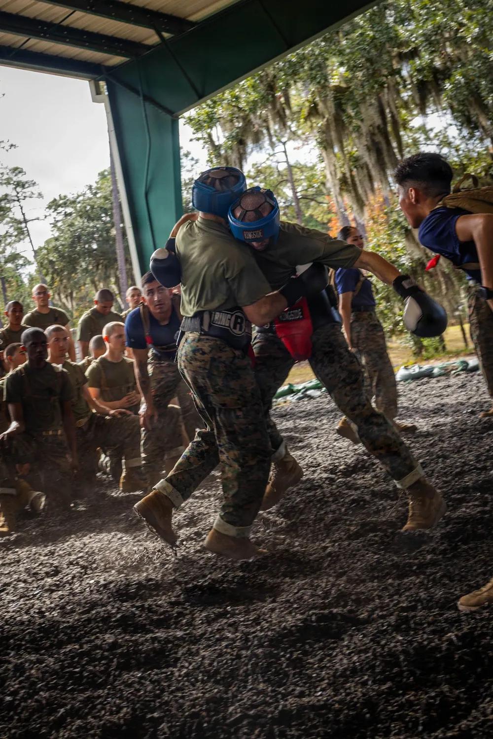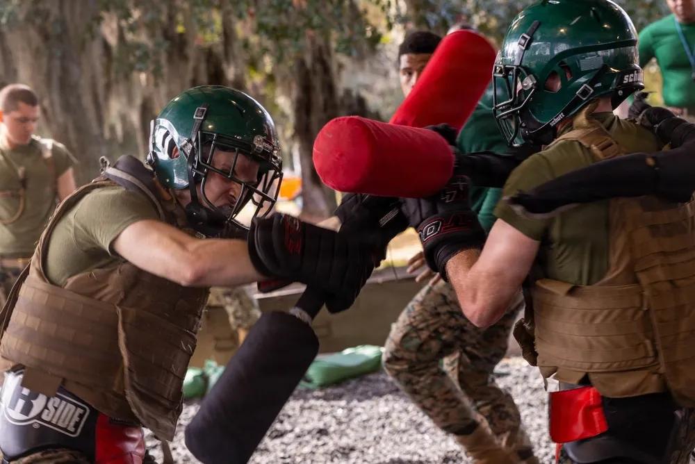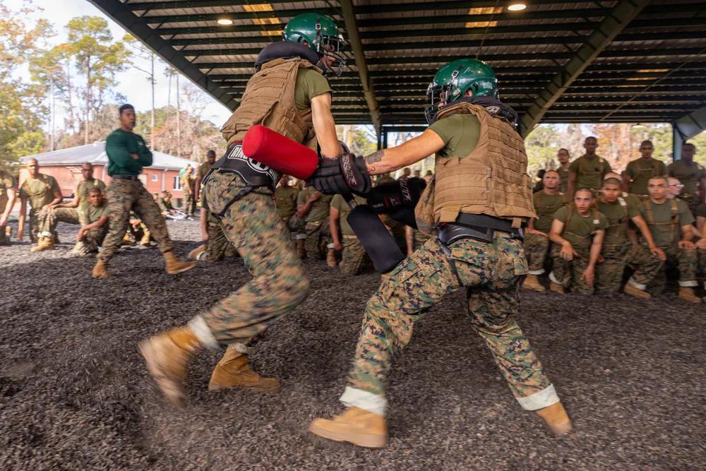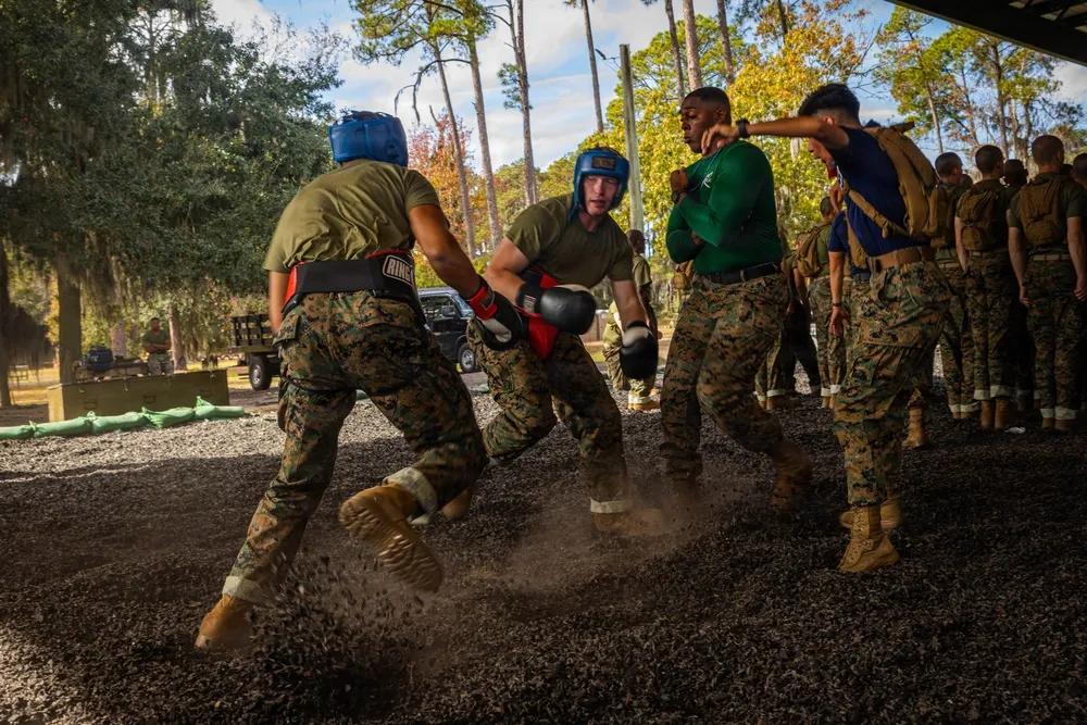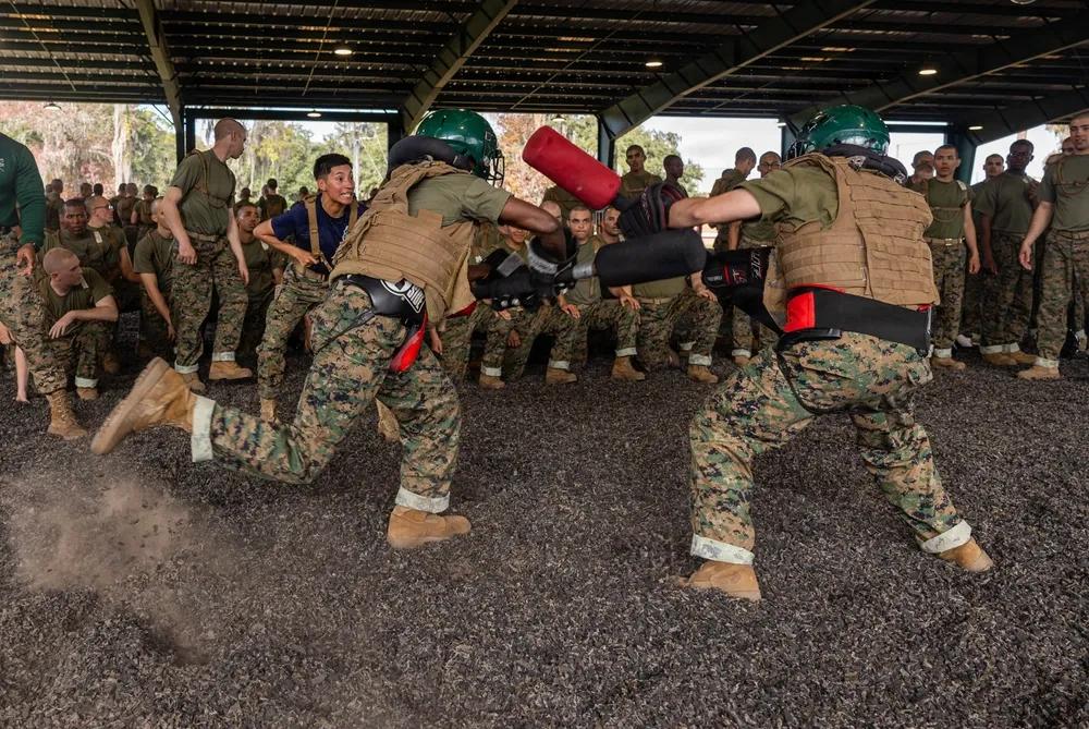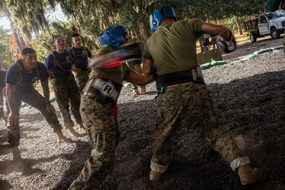 美军新兵实战训练强度也不小,但西洋拳比不上中国功夫。 2025年11月25日,美军第3新兵训练营十一连的新兵在南卡罗来纳州帕里斯岛海军陆战队新兵训练基地参加一次身体格斗活动。海军陆战队综合武术(MCMAP)通过身体格斗和木棒训练新兵的自卫能力,培养战士精神和团队精神,继承军团在卓越、战备和捍卫国家承诺方面的传统。