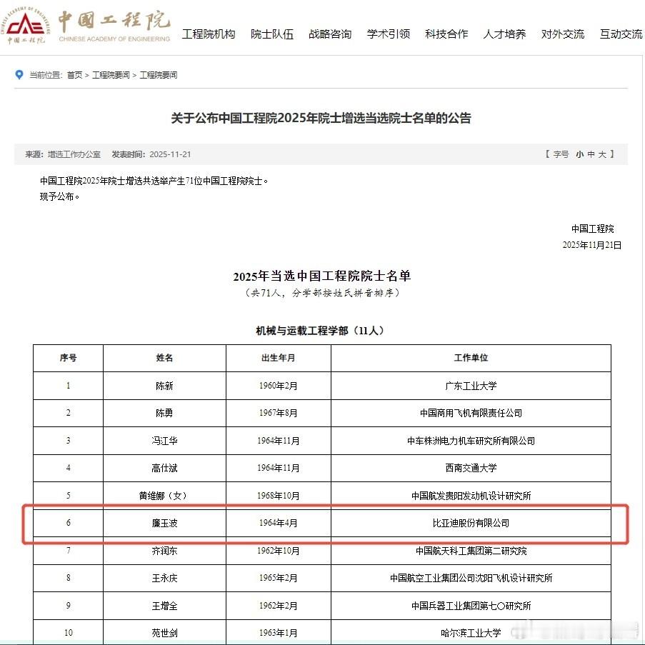 以技立身荣膺院士!比亚迪廉玉波当选中国工程院院士11 月 21 日,中国工程院公布 2025 年院士增选结果,比亚迪集团首席科学家、汽车总工程师廉玉波成功当选。作为机械与运载工程学部当选者之一,廉玉波长期深耕新能源汽车关键系统及整车研发,斩获多项核心技术突破。这份荣誉不仅是对他个人科研成就的高度认可,更彰显了比亚迪 “技术为王,创新为本” 的发展理念。未来,比亚迪将继续秉持工程师文化,为中国汽车产业高质量发展持续赋能!