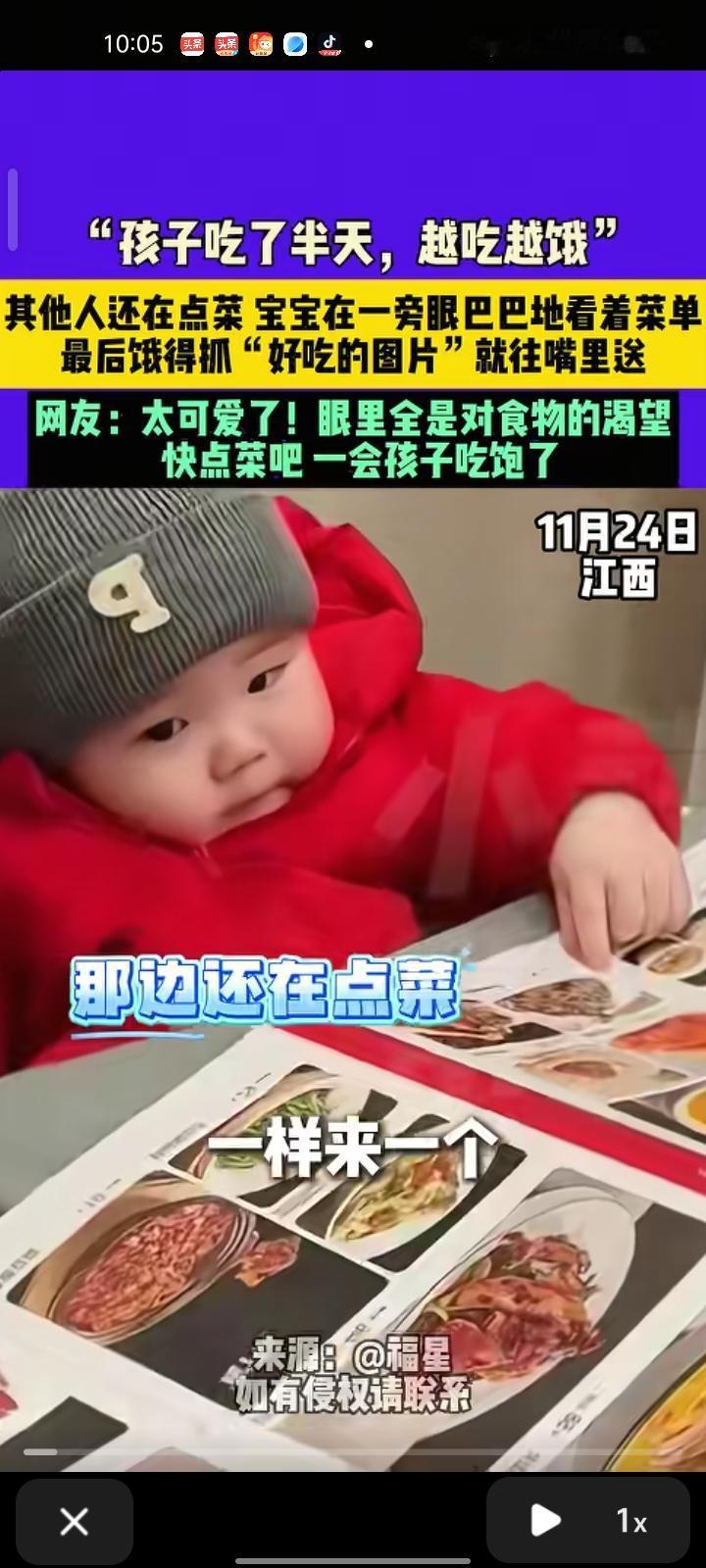 11月24日,江西南昌。网友晒视频称,其他人点菜的时候,宝宝在一旁眼巴巴的看着菜单,最后饿到抓“好吃的图片”就往嘴里送,怎么看好像是吃空气。网友:太可爱了,眼里全是对食物的渴望