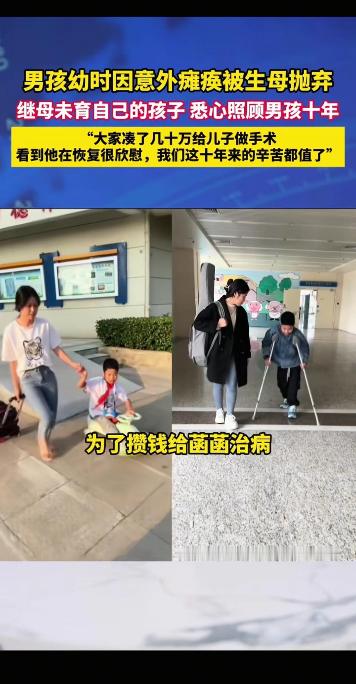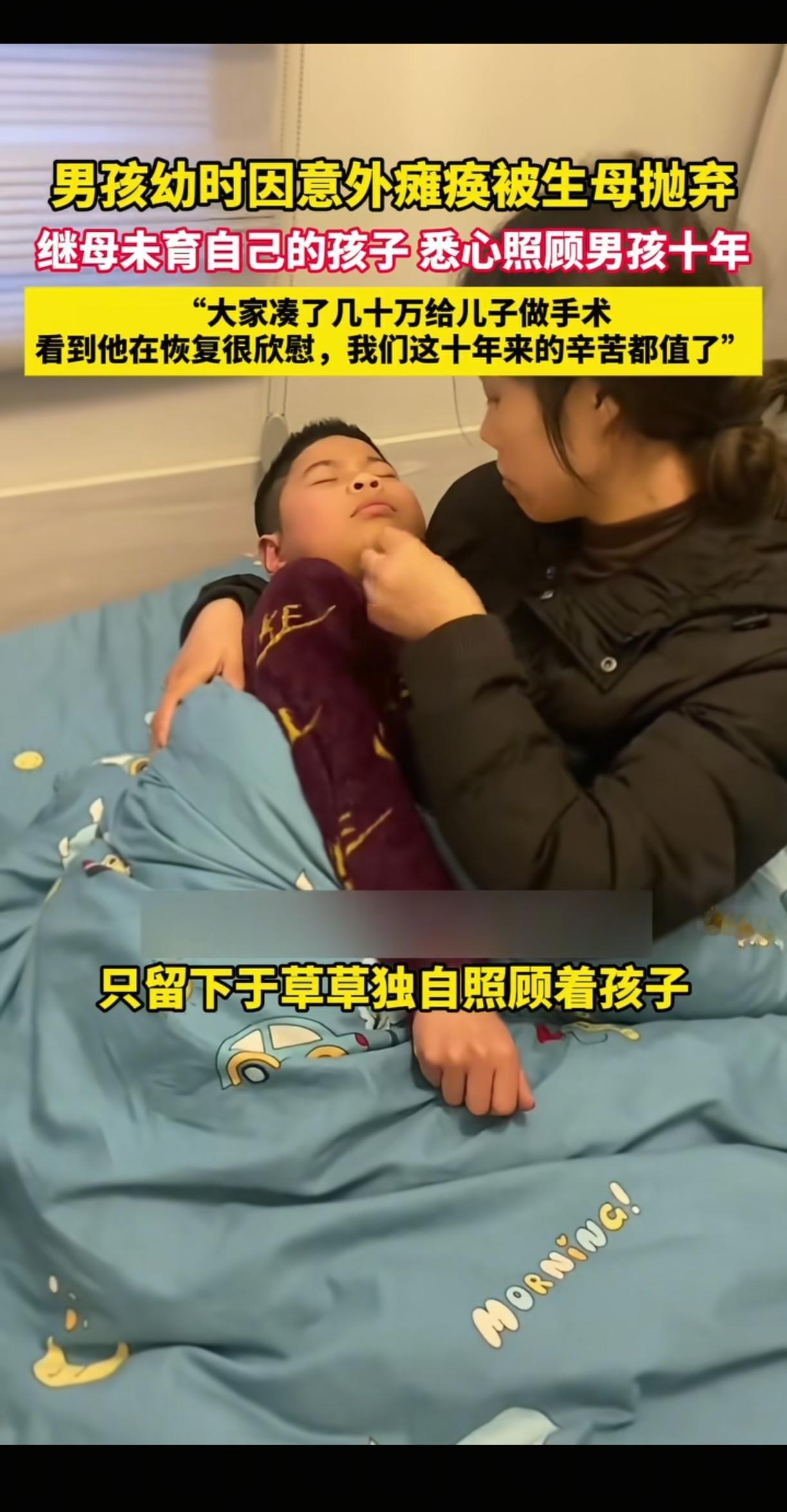安徽毫州,男孩6个月大时被查出神经母细胞瘤,在做切除手术时,不慎伤到脊柱神经,导致下半身瘫痪。母亲不堪重负离家出走。怎料,父亲给他找了一个19岁的后妈,谁曾想,就是这个后妈,在之后的日子里,对男孩的态度却让人意想不到! 这个男孩叫菡菡,出生6个月时遭遇意外,下半身瘫痪,生母随后离家。之后,19岁的于草草嫁给了菡菡的爸爸。为了给菡菡治病,菡菡的爸爸和爷爷奶奶都外出打工,家里就剩下于草草独自照顾菡菡。 这么多年,于草草每天的生活都围绕着菡菡。给菡菡喂饭、擦身、做康复训练,这些事她一做就是十年。菡菡的康复训练很辛苦,于草草总是耐心地陪着他,一遍又一遍地帮他练习站立、走路。 为了凑齐菡菡的手术费,于草草自己省吃俭用,还从娘家借了不少钱。手术费有六七十万,对这个家庭来说是笔巨款,但于草草从没放弃。 后来菡菡做了手术,现在能站立还能走几步路了。于草草看着儿子的进步,觉得这十年来的辛苦都值了。她还说,等明年儿子情况稳定些,就考虑试管要个自己的孩子。其实之前她意外怀过孕,但那时菡菡需要人照顾,她就选择了放弃。 周围的人都很佩服于草草,觉得她一个年轻姑娘,能十年如一日地照顾瘫痪的继子,还为了他放弃自己生孩子的机会,特别不容易。她的这份爱,超越了血缘,温暖了菡菡的童年,也感动了很多人。 各位读者你们怎么看?欢迎在评论区讨论。 来源:宁波晚报 2025-11-24报道