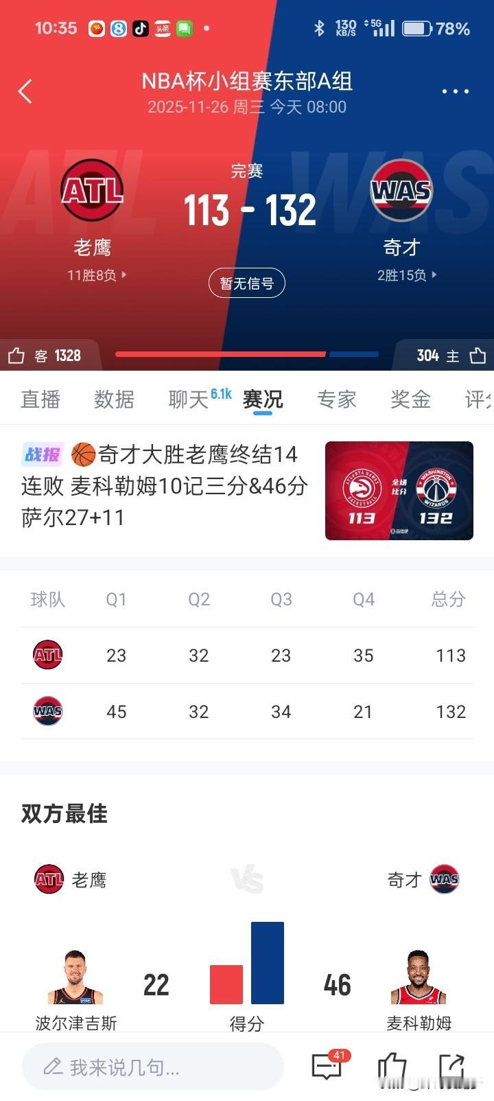 奇才终结14连败!太不容易了!输这么多!还好今天遇到老鹰,真是送温暖!鹰王约翰逊正常低迷,只拿7分!奇才麦科勒姆拿到46分,投进10记三分!萨尔27+11,全场压制老鹰!比赛早早进入垃圾时间!最终113-132大胜老鹰!湖人奇才 奇才队阵容 奇才队乔丹