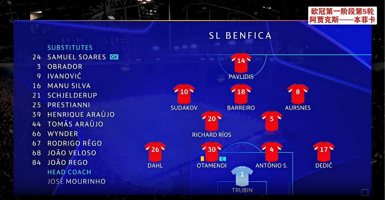 穆里尼奥重回4231阵型,有几个位置做了微调,同时也是确定了心目中的最佳11人。后防线从左到右,达尔、奥塔门迪、席尔瓦和德迪奇,阿劳若替补,最终在补时阶段,与马努、小雷戈,替补登场,拿份赢球奖金,也代表了他们在穆帅心中的位置,可以角逐主力阵容。 24岁的阿根廷节拍器巴雷内切亚,与25岁的哥伦比亚悍将里奥斯,搭档双后腰。25岁的卢森堡国脚巴雷罗,这种类似斯内德的防反型前腰,成为4231的核心球员。23岁的右脚球员苏达科夫,打边前腰位置。即将30岁的挪威8号奥尔斯内斯,从后腰变成了边前腰。希腊凯恩帕夫利季斯单箭头。