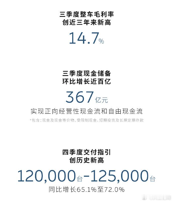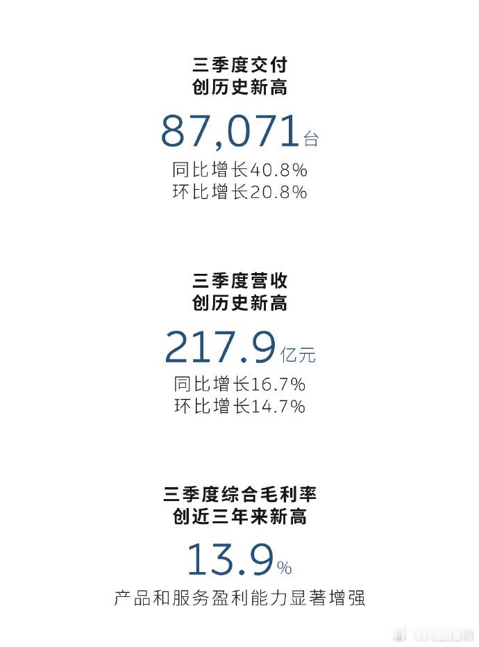 蔚来2025年三季度财报 三个新高三季度交付8.7万,创历史新高三季度营收217.9亿元,创历史新高三季度整车毛利率14.7%,创近三年新高要想四季度盈利,月均交付需达到4万辆以上毛利率需要达到18%,在当前环境下维持如此高的毛利率非常困难
