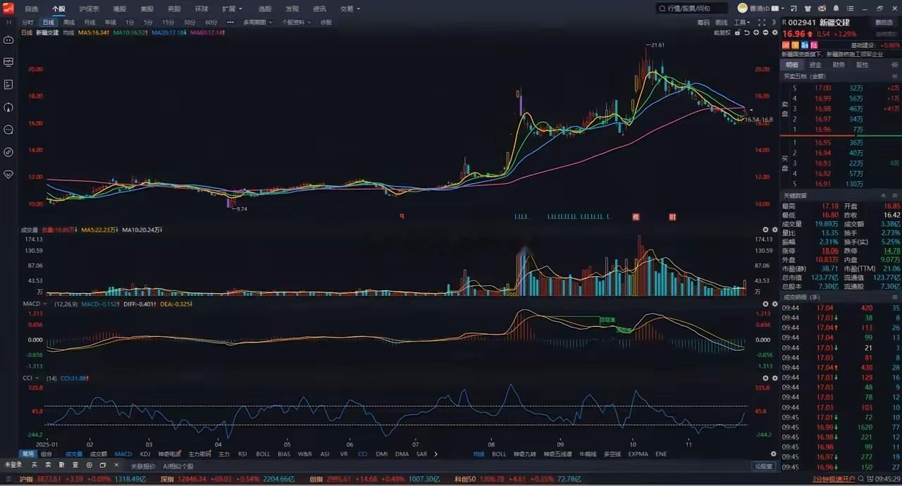 新疆交建(002941)深度解析:区域基建龙头的政策红利与成长潜力作为新疆国资委控股的本土基建龙头企业,新疆交建(002941)深耕公路、桥梁、隧道等基建施工及配套材料贸易领域,凭借区域垄断性优势与政策红利加持,成为新疆基建大开发浪潮中的核心受益标的。以下从基本面、核心优势、潜在风险及投资逻辑展开全面分析:一、核心基本面:业绩修复提速,订单储备充足新疆交建在新疆本地基建市场占据绝对主导地位,本土市场份额位居疆内施工企业首位,尤其在高原冻土、戈壁沙漠等特殊地质施工领域具备独家技术壁垒,该类特色业务毛利率较同行高出8个百分点,形成差异化竞争优势。2025年三季度核心财务数据表现亮眼:实现营业收入57.55亿元(行业排名15/23),净利润4.4亿元(行业排名12/23),盈利能力稳步提升;资产负债率降至69.97%,较去年同期的73.72%及行业平均的72.81%显著下降,财务结构持续优化;毛利率11.64%虽略低于行业平均的11.72%,但结合其特色施工业务优势,盈利质量具备改善空间。订单方面,截至2025年中,公司在手订单规模达270.27亿元,是上半年营收的10.67倍,充足的订单储备为未来2-3年业绩增长提供坚实支撑,业绩确定性较强。二、核心优势:政策+资源+业绩三重共振1. 政策红利持续释放:新疆作为“一带一路”核心区,2025年规划实施重点项目500个,总投资规模达3.47万亿元,叠加高标准农田建设等政策落地,区域基建投资力度空前,为公司带来源源不断的项目储备,业务增长动力充足。2. 区域竞争壁垒显著:作为自治区属国有企业,公司与当地政府合作关系紧密,在项目获取上具备天然资源优势;同时构建了涵盖勘察设计、施工建设、材料贸易的全产业链布局,进一步巩固了在本地市场的领先地位,竞争对手难以复制。3. 业绩修复态势明确:2025年上半年公司归母净利润2.55亿元,同比大幅增长255.25%,成功扭转一季度亏损局面,经营质量持续改善,随着订单逐步落地转化,业绩增长动能有望进一步释放。三、潜在风险:规模与结构待优化1. 行业竞争格局受限:营收规模与中铁、铁建等全国性基建龙头存在较大差距,在跨区域项目拓展与行业资源整合能力上仍有提升空间,全国性竞争力较弱。2. 业务结构相对单一:施工业务占比高达97.29%,业务结构集中导致抗风险能力较弱,且整体毛利率略低于行业平均,盈利效率有待提升。3. 现金流压力尚未缓解:2025年三季度经营活动现金流净额仅1.25亿元,投资活动现金流为-5.56亿元,现金流紧张问题尚未完全解决,可能影响项目推进与资金周转效率。四、投资逻辑总结新疆交建的核心投资价值在于新疆基建领域的区域垄断性+政策红利密集释放,充足的在手订单为短期业绩提供强支撑,2025年11月26日股价17.01元(涨幅3.84%)、总市值124.28亿元,市盈率TTM 21.12倍处于行业中等水平,估值具备一定安全边际。短期来看,股价受区域基建政策落地节奏、项目开工进度等因素催化明显;中长期需重点关注毛利率提升、业务多元化拓展(如拓展新能源基建、生态治理等领域)及现金流改善情况。该标的适合聚焦区域基建赛道、关注政策落地兑现的投资者,需理性看待其规模瓶颈与业务结构风险,结合行业周期与公司经营数据动态调整预期。以上信息基于公开资料整理分析,仅为投资参考,不构成任何投资建议。股市有风险,投资需谨慎。