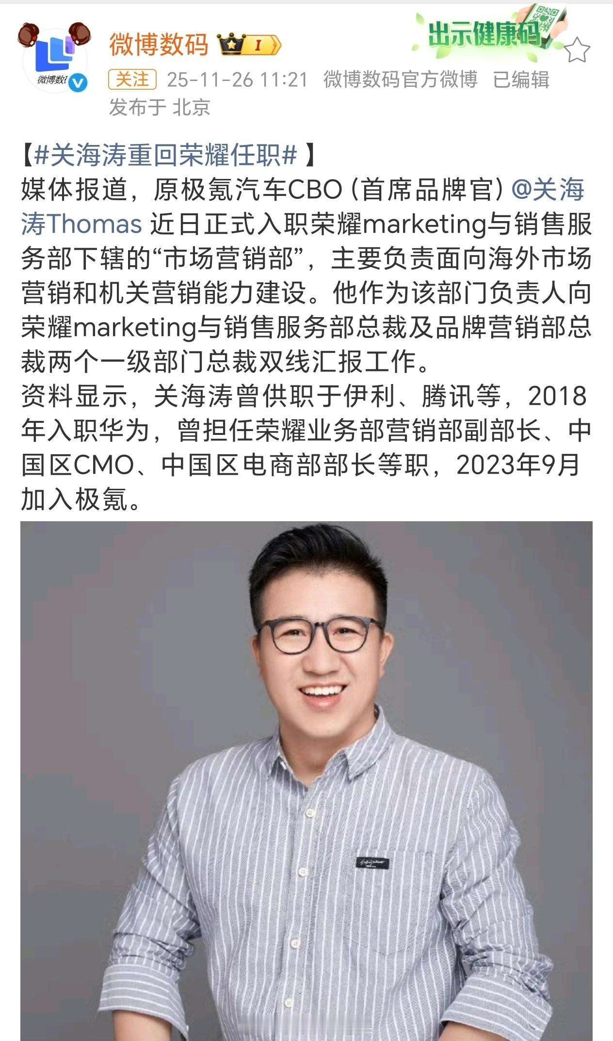 关海涛重回荣耀任职 说来说去为什么汽车会越来越像手机这种快消品呢?因为都是同一拨人在做嘛~