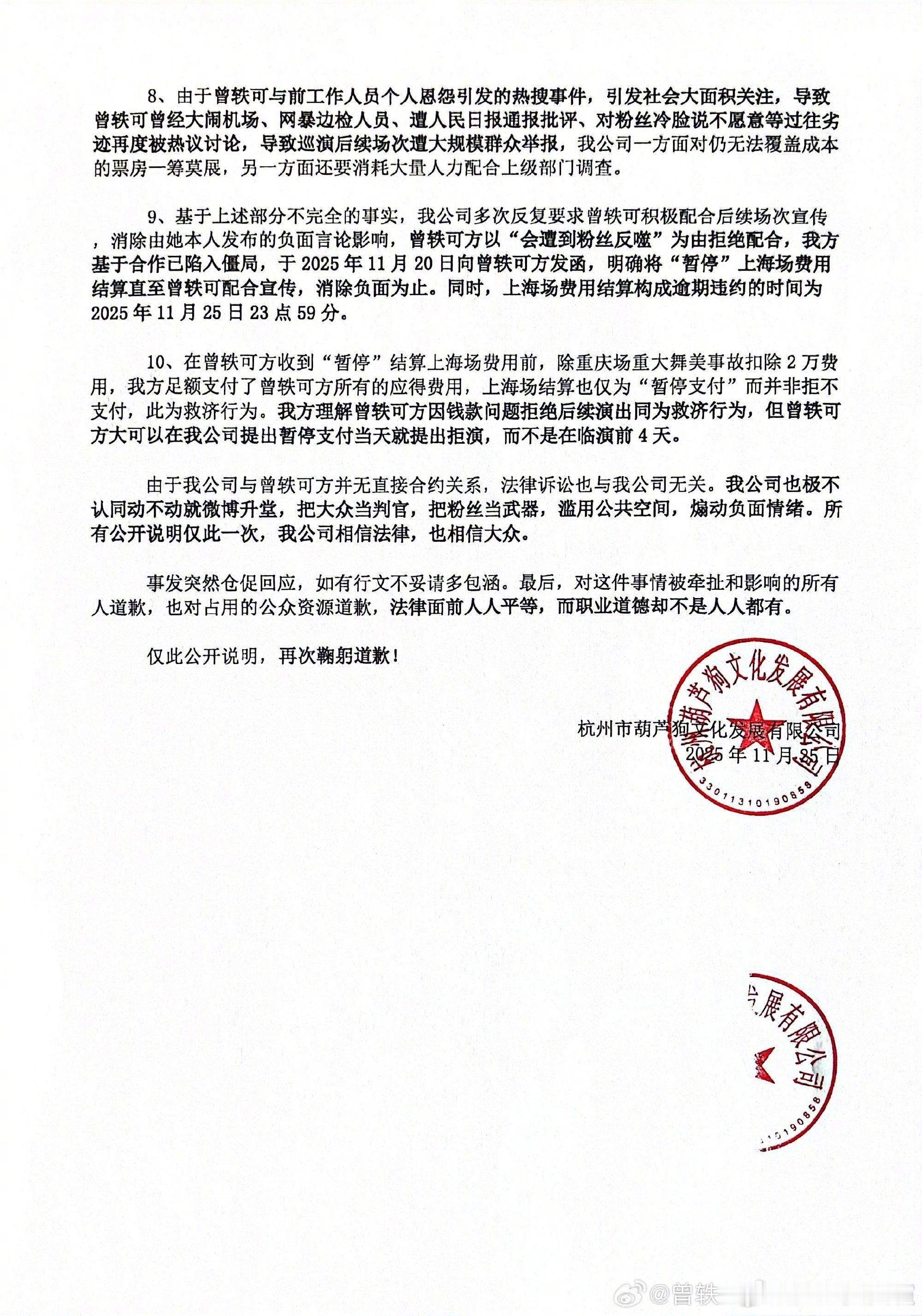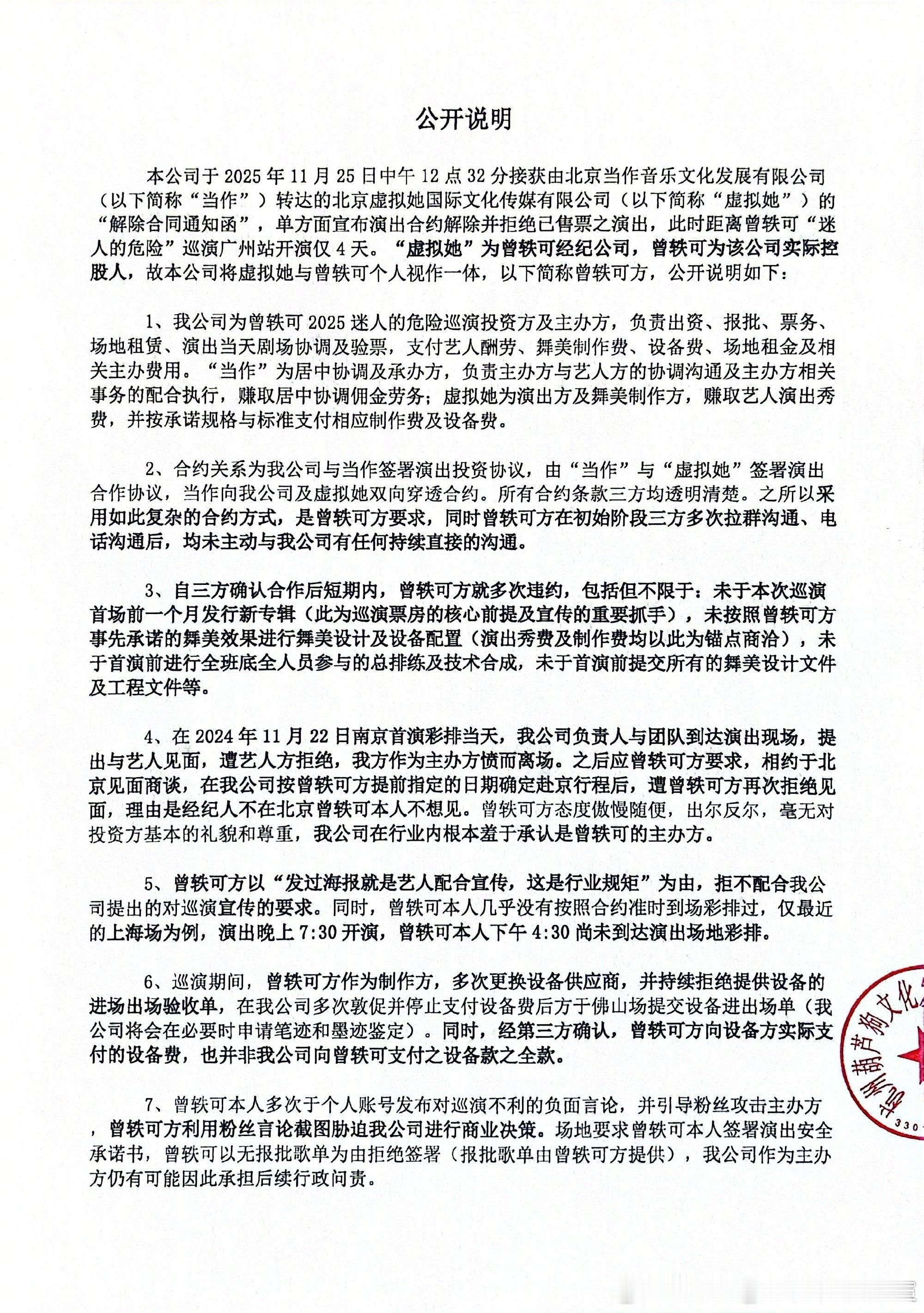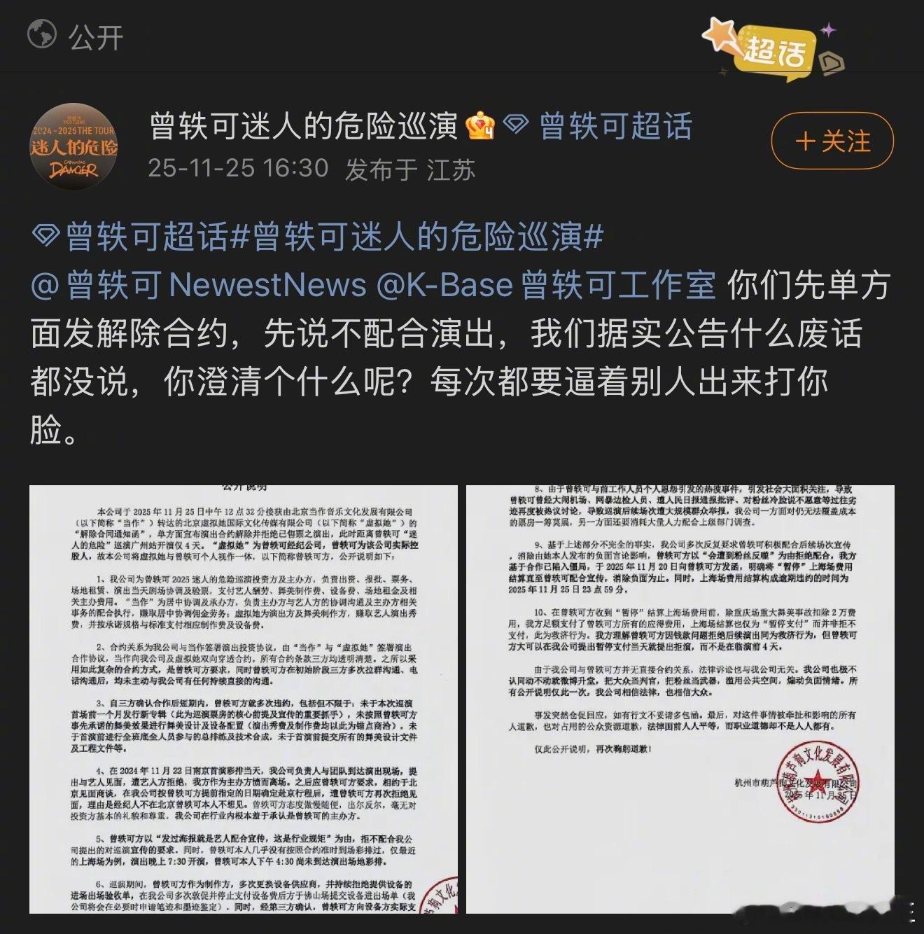 巡演主办方喊话曾轶可工作室 原来曾轶可的风波还没结束,昨天曾轶可的巡演主办方发文控诉曾轶可方在演出前4天单方面解约并拒绝演出、在合作期间有多次出现违约行为、拒绝与巡演工作人员见面谈工作、不配合宣传、发布不利巡演言论等行为,还牵扯出之前大闹机场网报边检人员的舆情再次发酵等多达数10条,放话“职业道德不是人人都有”。