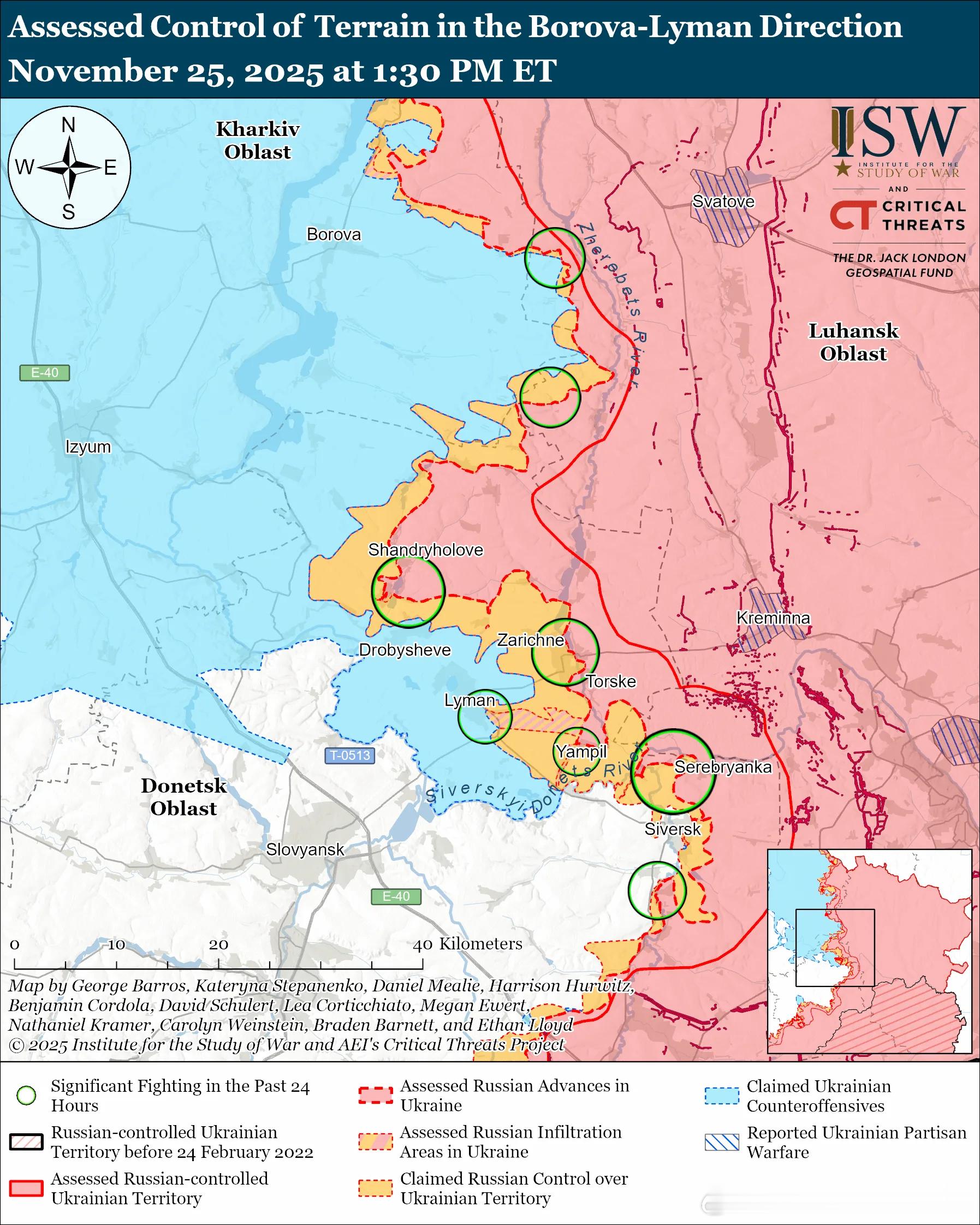俄军主要行动2俄军目标:占领卢甘斯克州剩余部分,向西推进至哈尔科夫州东部,并包围顿涅茨克州北部。11月25日俄军继续向库皮扬斯克方向发起进攻,但并未取得确切进展。未经证实的说法:一位俄罗斯军事博主声称,俄军向彼得罗巴甫洛夫卡东南(库皮扬斯克以东)推进。11 月 24 日和 25 日,俄军在库皮扬斯克附近、库皮扬斯克以东的彼得罗巴甫利夫卡附近以及库皮扬斯克东南的皮什恰内附近发动了进攻。战斗序列:据报道俄第68摩步师(列宁格勒军区第6合成集团军)正在哈尔科夫州打击乌克兰军队。莫斯科军区第1近卫坦克集团军的(FPV)无人机操作员正在奥斯基尔河东岸(左岸)打击乌克兰军队。11月24日和25日,俄军继续在博罗瓦以东的纳迪亚附近和博罗瓦东南的赫雷基夫卡附近发动进攻,但并未取得进展。11月25日俄军继续在斯拉维扬斯克-利曼方向发动进攻,但并未取得确切进展。未经证实的说法:俄罗斯军事博客作者声称,俄军已向莱曼以东推进,朝莱曼东南部的T-0513莱曼-西韦尔斯克公路方向推进,并进入了扬皮尔西南部(莱曼东南部)。一位俄罗斯军事博客作者声称,在俄军渗透行动于斯塔夫基(莱曼北部)升旗后,该地区仍是一个有争议的“灰色地带”。该俄罗斯军事博客作者还报告说,乌克兰军队仍然控制着斯塔夫基西部(莱曼北部)的阵地,这与俄罗斯声称已占领整个斯塔夫基的说法相矛盾。11月24日和25日,俄军在莱曼附近、莱曼西北部的尚德里霍洛韦、新谢利夫卡和德罗比舍韦附近、莱曼北部的斯塔夫基附近、莱曼东部的扎里奇涅和托尔斯克附近以及莱曼东南部的扬皮尔和奥泽尔内附近发动了进攻。一位俄罗斯军事博主声称,乌克兰军队在斯塔夫基附近进行了反击。乌克兰媒体《乌克兰真理报》11月25日报道称,俄军曾多次进入莱曼镇,但每次都被乌克兰军队击退,阻止了俄军在该镇长期驻扎。一名乌克兰无人机部队的士兵告诉《乌克兰真理报》,俄军在夺取莱曼方向的关键高地后,控制了E-40斯拉维扬斯克-伊久姆公路的火力。《乌克兰真理报》报道称2025年9月下旬,谢列布里扬斯克森林地区(位于莱曼镇东南部)的失守使前线推进至莱曼-扬皮尔铁路沿线,俄军得以推进至莱曼镇郊区,并在扬皮尔附近形成了一个大片的争夺激烈的“灰色地带”。一名在莱曼方向作战的乌克兰军人11月25日表示,俄军使用无人机支援步兵,偶尔也使用摩托车进行进攻。这位乌克兰军人表示,俄军主要在清晨和傍晚发动袭击,有时也会在白天利用浓雾发动攻击,因为浓雾会阻碍乌克兰无人机的行动。他还表示,俄军的目标是通过持续不断的无人机袭击来破坏乌克兰的后勤保障,这些袭击包括使用(FPV)无人机、光纤无人机和潜伏无人机。作战序列:据报道俄罗斯鲁比孔先进无人技术中心的无人机操作员正在鲁布齐(莱曼西北部)方向作战。