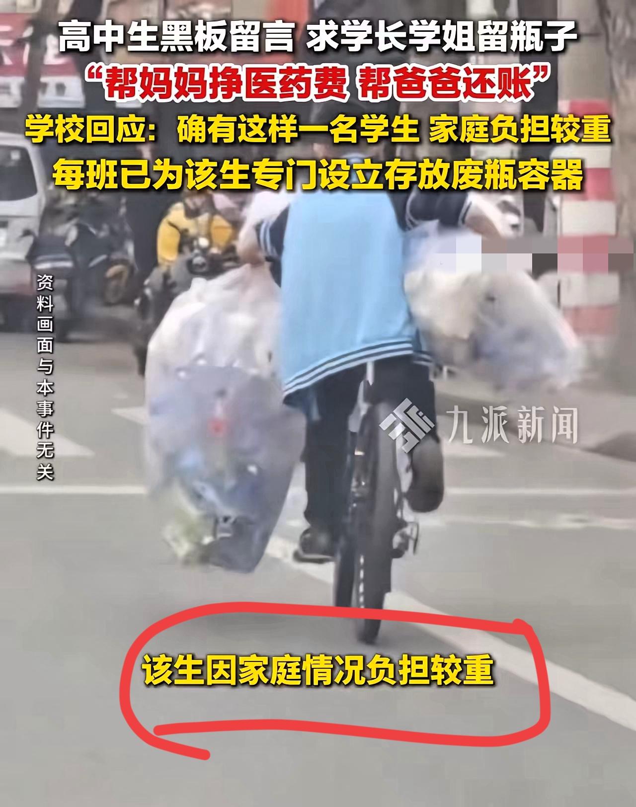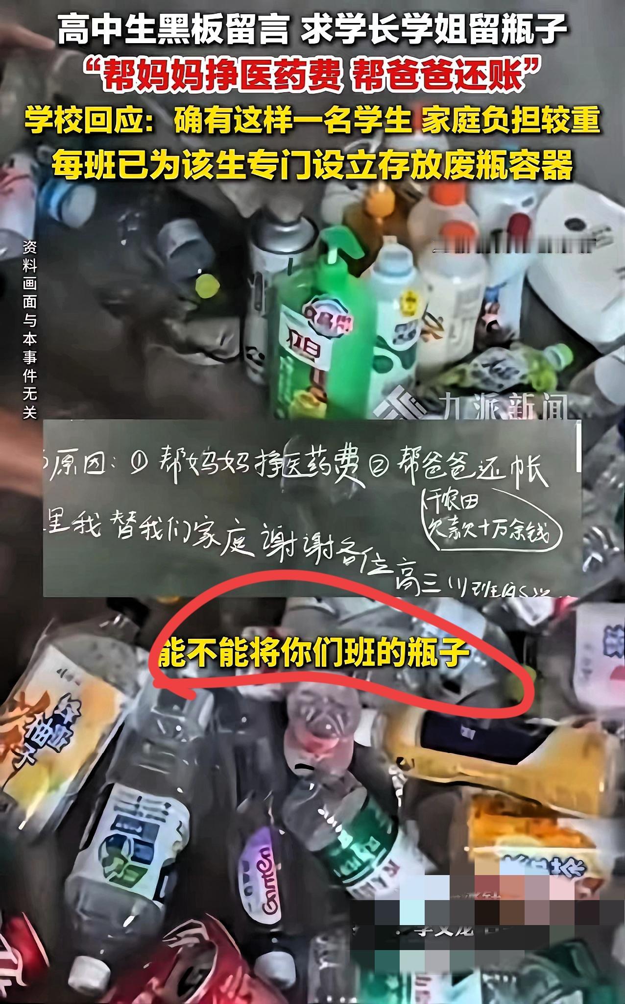 这届高中生太顶了!黑板上的求助留言看哭无数人,却藏着最动人的担当! “求学长学姐把喝完的瓶子留给我,帮妈妈挣医药费、替爸爸还10万债”,稚嫩的字迹里,没有抱怨只有懂事,还特意叮嘱“学生会看到不要扣分”,生怕给班级添麻烦。 家庭负债、母亲重病,这个高中生没逃避没自卑,用捡瓶子这种最朴素的方式,给风雨飘摇的家撑起希望。更暖心的是学校的做法,让每个班设专门容器,用包容守护孩子的尊严。 都说现在的孩子娇生惯养,可这个少年用行动证明:担当从不分年龄,困境里的坚守比任何光环都耀眼。他放下的不是面子,是对家人的爱;捡起的不只是瓶子,是直面生活的勇气。 真正的成长从不是顺风顺水的安逸,而是在磨难中依然选择向阳而生。这样有责任、有骨气的孩子,未来一定不会差! 你被这个高中生的举动打动了吗?如果遇到类似情况,你会怎么帮他?来评论区聊聊~