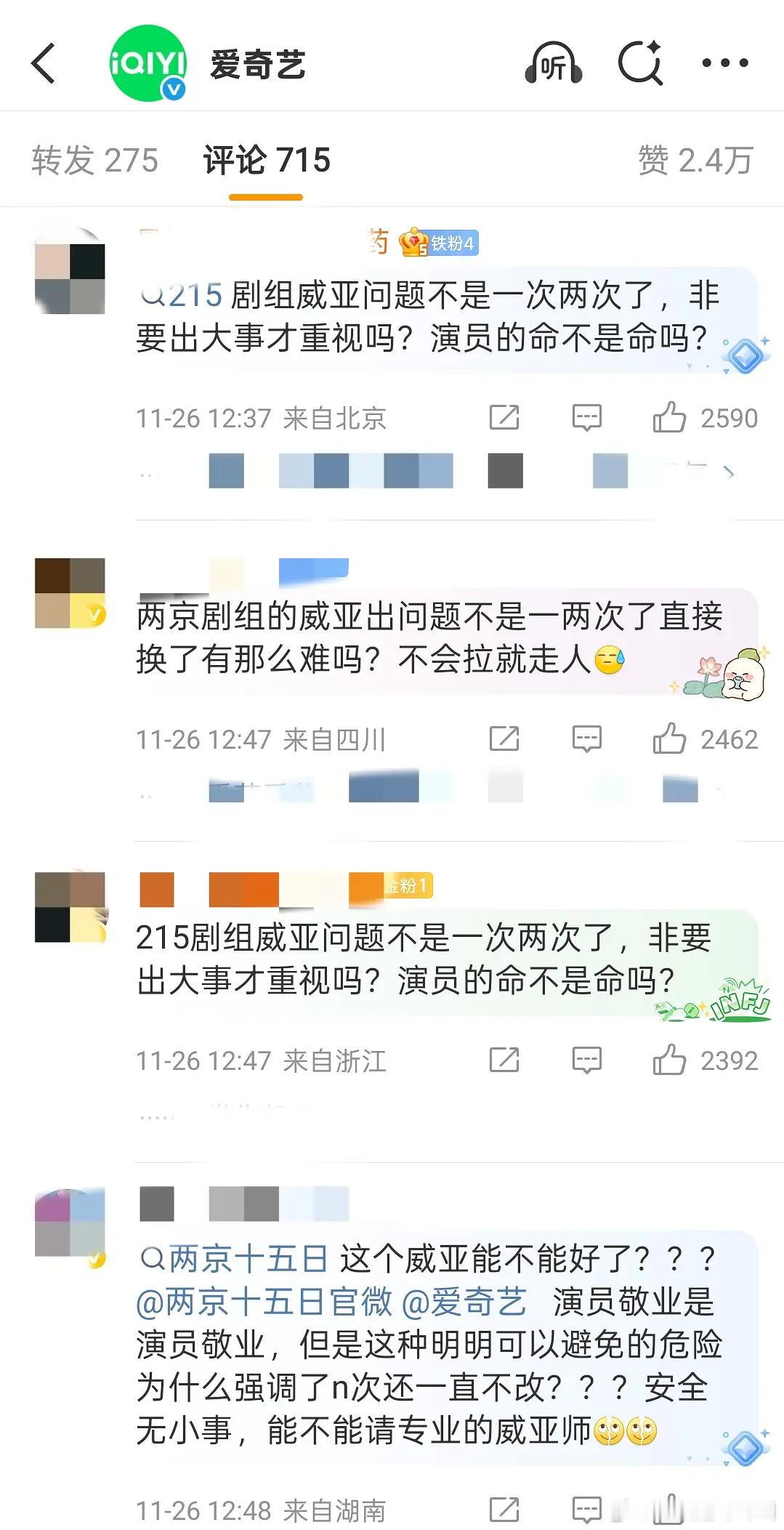 成毅粉丝在爱奇艺发布的微博评论区维权,好像是两京十五日威亚问题。