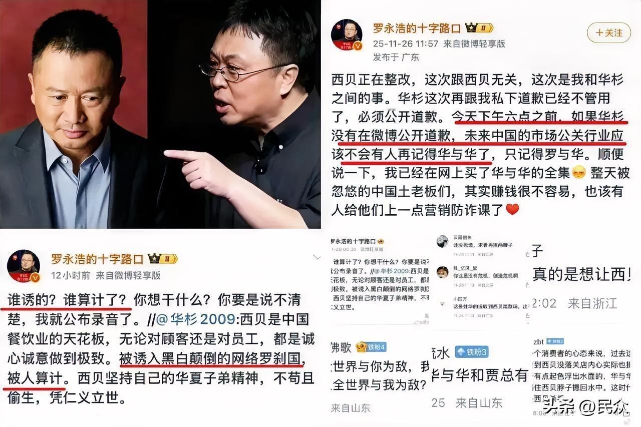 贾国龙现在肯定气疯了罗永浩与西贝的争论不休,先是罗永浩怒怼西贝西贝创始人贾国龙,随后罗永浩与西贝创始人贾国龙语音互怼两人,争论了将近一个小时,两人各自退一步,争论暂时平息!没想到华与华CEO华杉却在微博力挺西贝,说西贝是东方大国餐饮业的天花板,并且还暗指罗永浩与西贝创始人贾国龙别的心眼,华杉此举明显是在帮西贝打脸罗永浩,这让罗永浩气不打一处来!罗永浩马上在微博发文怒怼华杉,称华杉如果不在今天下午6点之前公开道歉,他将让华与华从市场公关行业消失!华与华是西贝的公关公司,难道不应该帮西贝平息争论,反而火上浇油吗?此事后面又将如何发展?让我们拭目以待!