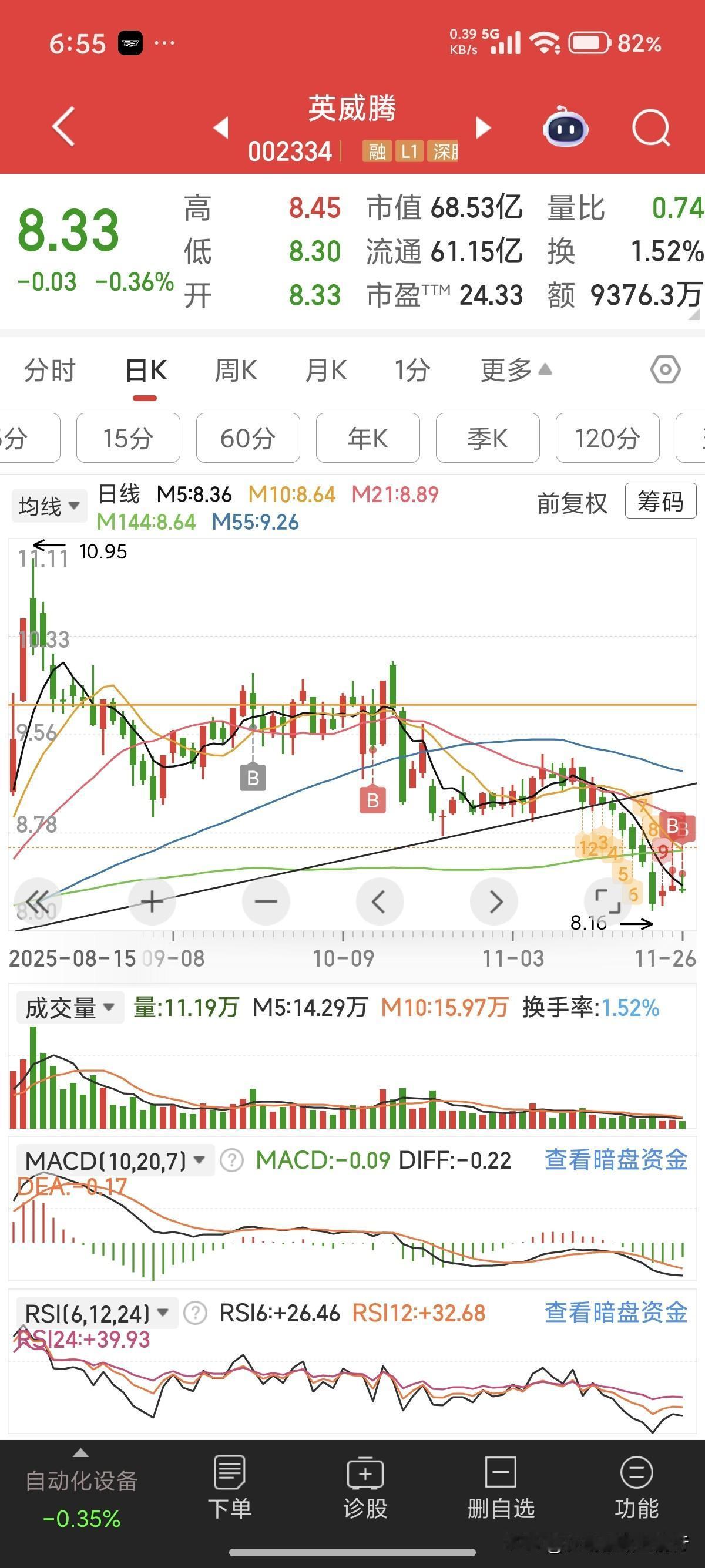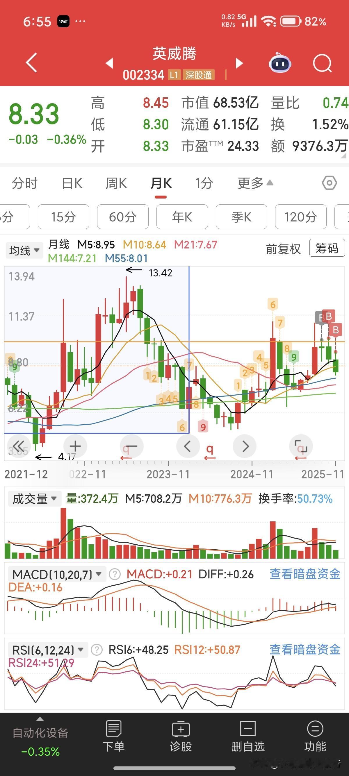十万变百万。今天又加了1500股英威腾,其实日线已经破半年线了,且三天都没收复前面的大阴线,但月线还好,缩量挺好的,下个月应该能等个涨停。