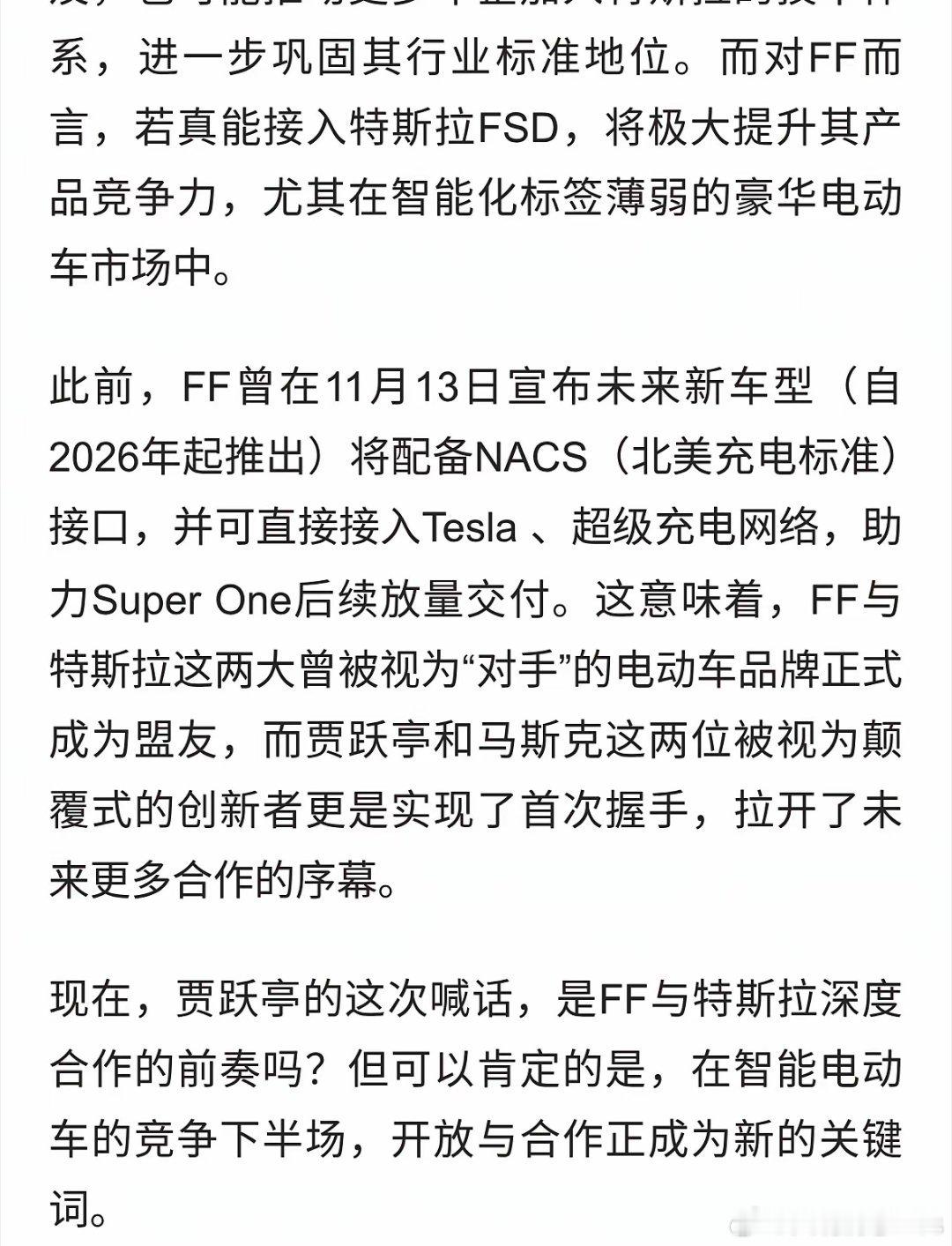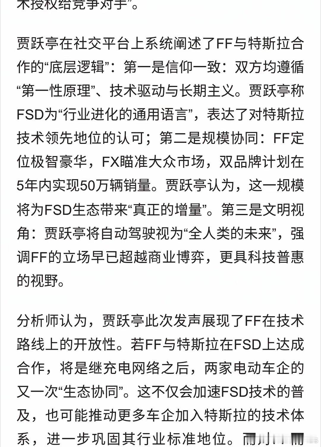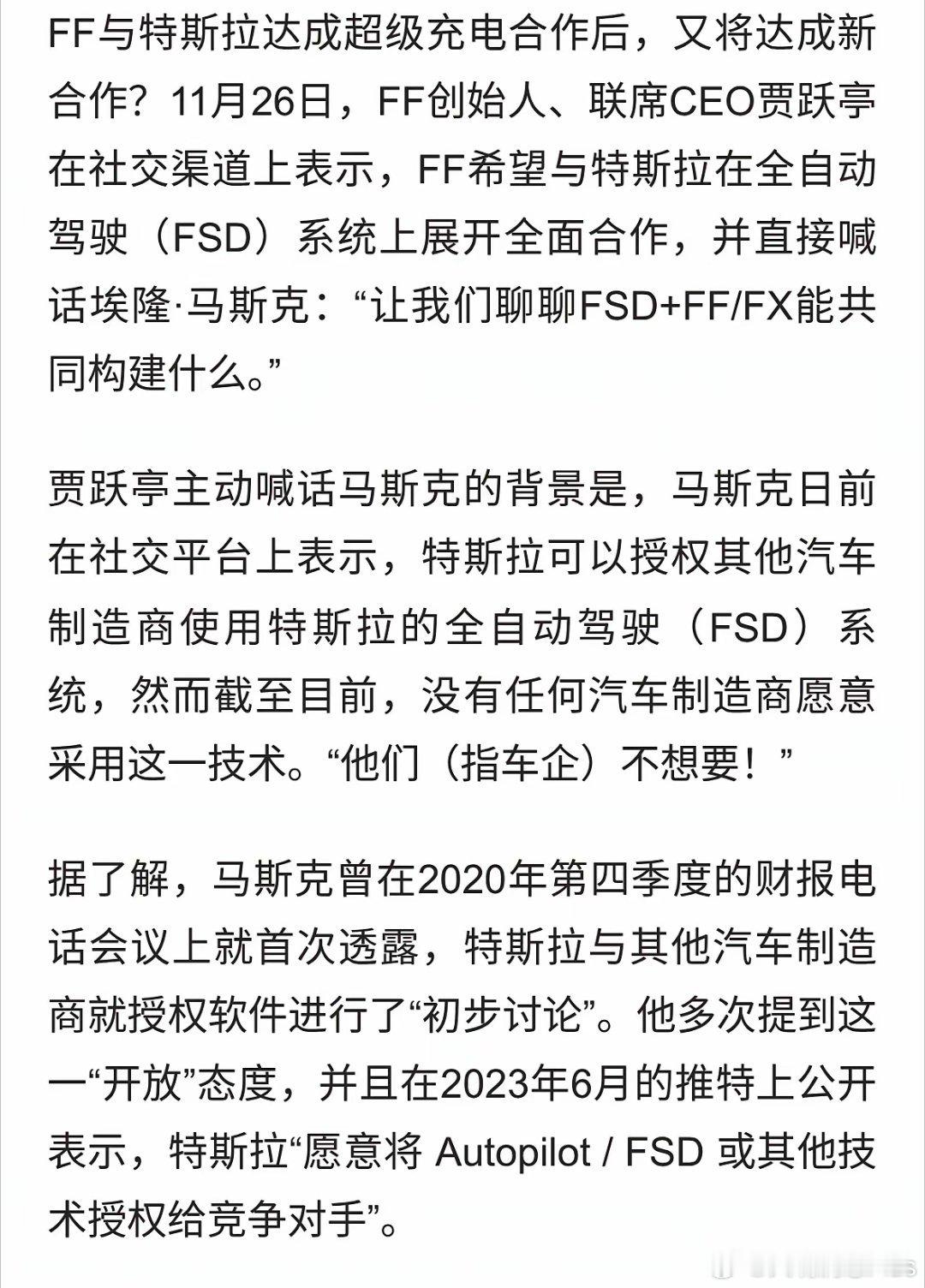 马斯克吐槽传统车企不接受FSD!贾跃亭秒回:FF、FX愿全面合作