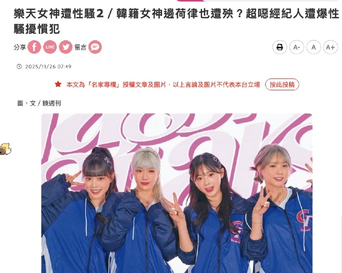 曝韩籍经纪人长期性骚扰艺人曝艺人廉世彬长期被经纪人性骚扰据台媒,近日,有爆料称韩国艺人廉世彬长期遭受韩籍黄姓经纪人的性骚扰。一个月之前,廉世彬所属台籍经纪公司负责人高伟凯的社交平台发文,虽未明确提及 “性骚扰” 及当事人姓名,但文中 “你以为你很专业,跟紧紧照顾她,问题人家当你是变态啊”“公司被你烦到所有人都要去看医生”“合约到期绝不续约”等表述,结合此次爆料,已被确认指向该韩籍黄姓经纪人。据体育圈消息人士透露,黄姓男子自2024年起在台湾开展韩籍啦啦队经纪业务,初期与台湾职棒 “中信兄弟” 球团达成合作,其旗下签约的韩籍啦啦队员包括边荷律、李丹妃等人。但合作仅持续数月,便因 “旗下队员反映其行为让人感觉不适” 的相关反馈,被“中信兄弟” 球团终止合作。台媒称,上述合作终止事件未对外公开,黄姓经纪人随后又陆续与韩籍艺人金娜妍、朴善珠签订在台经纪合约,而两人均被曝遭遇与廉世彬类似的骚扰问题。据悉,廉世彬为韩国前女子组合 S.I.S 成员,2017 年以团体主唱身份出道,组合解散后以个人身份持续活跃于演艺圈,此次被指为黄姓经纪人骚扰行为的核心受害者。