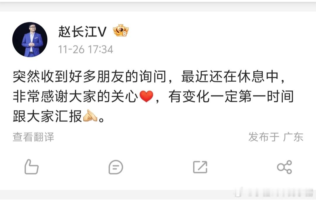 赵长江回应入职传闻 回应:还在休息中。至于媒体为什么要造这个谣?为何突然搞流量?当事人最清楚。总言之,我为赵哥打call,大家不信谣不传谣。倨能聊