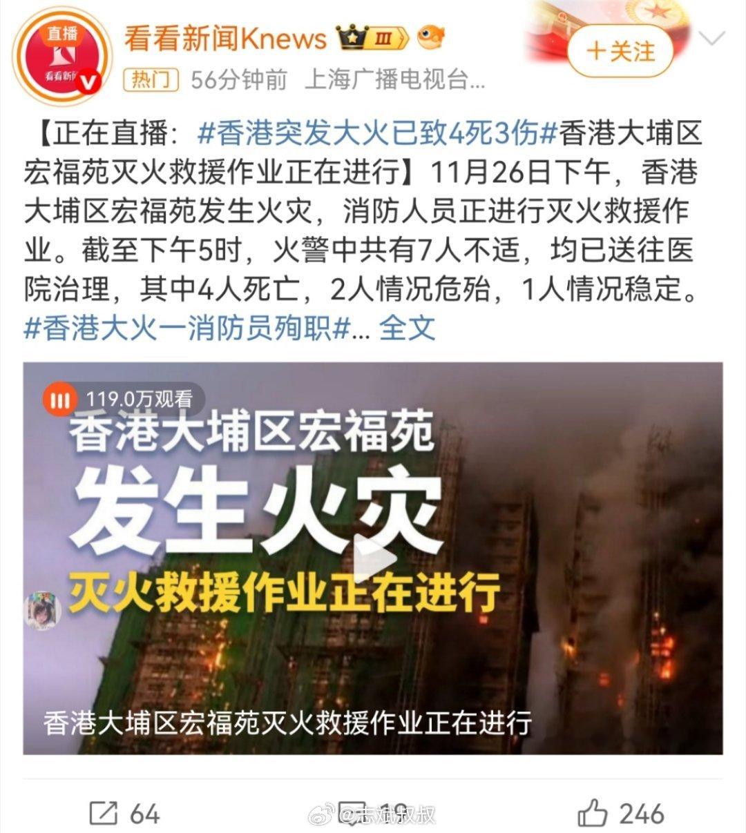 香港突发大火已致4死3伤天呐!?香港大埔宏福苑据说已经升级到五级火警了,而且有人员伤亡了。我猜这是不是跟屋苑外墙搭的竹棚有关系?被点燃了,然后火借风势… 广州
