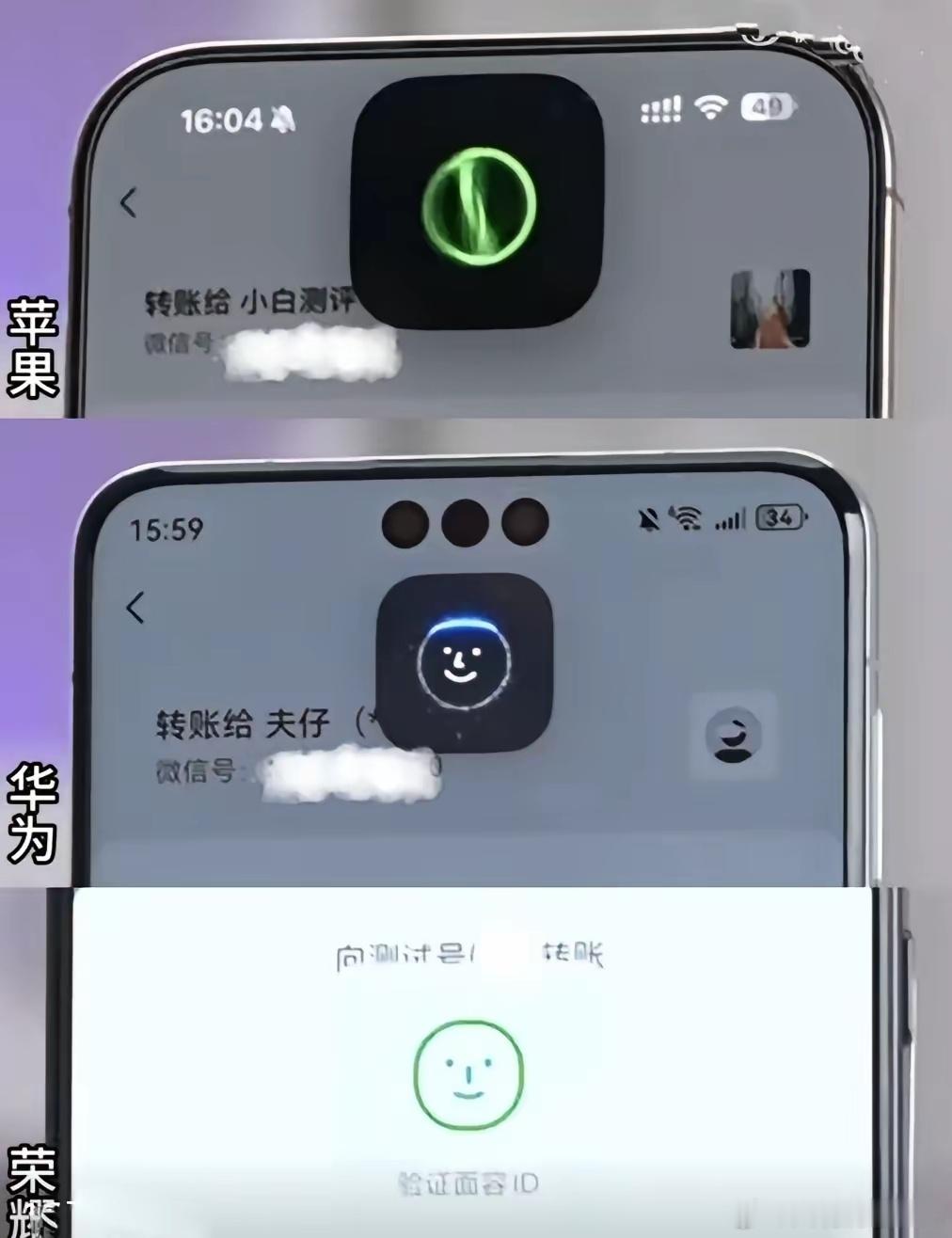 苹果、华为、荣耀的3D人脸支付动画对比。