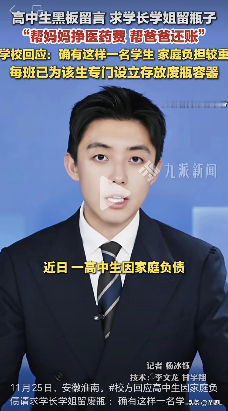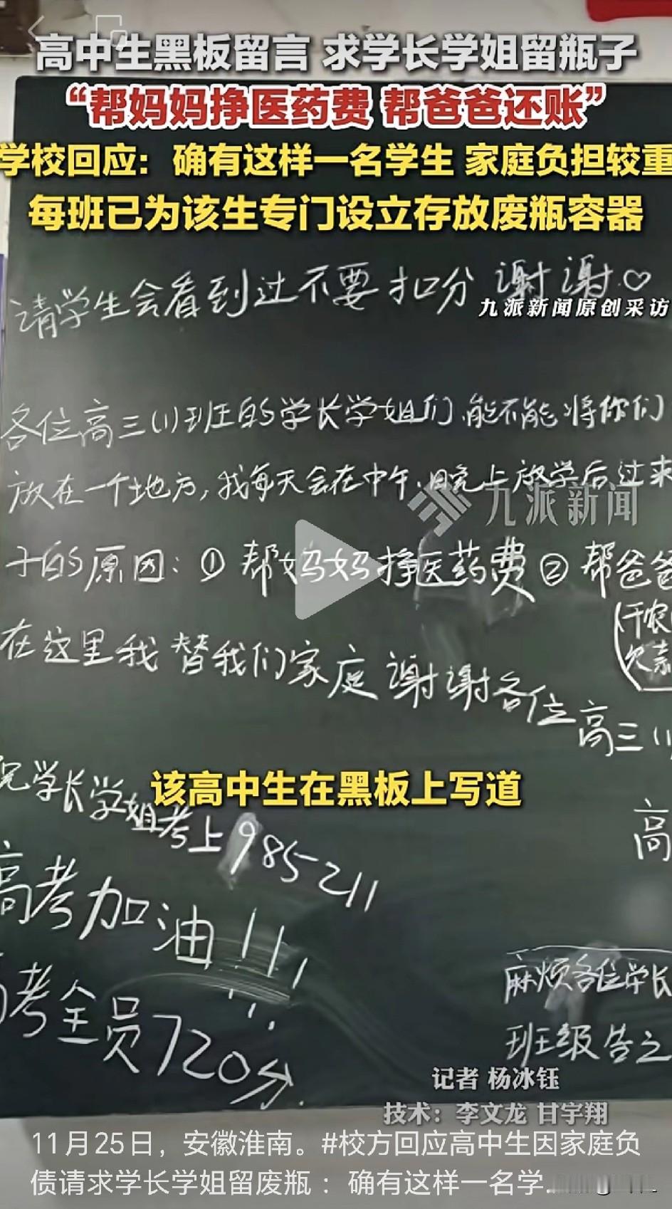 “请把瓶子留给我!”高二男孩黑板上的一段话,看哭了全网!他写下“家丑”,却赢得了所有人的尊重! 近日,安徽淮南某中学,一名高二学生的黑板报留言,在网络上引起了热议。 原来,这名高二男生,因为家庭负担重,母亲需要医药费,父亲种地欠债十几万元,每天就趁放学时间捡拾饮料瓶,来帮补家用。 为了提高效率,男生在黑板报上写下留言,说明自己的家庭状况,礼貌地恳请各位学长学姐,将废弃的饮料瓶集中存放,自己会在放学后去回收。并祝各位学长学姐高考顺利,全都考上985211。 而学校在确认男生的情况后,迅速为每个班级设置专用容器(盒子或桶)存放废瓶,方便学生放学后集中收集。 11月25日,校领导还走访其家庭,教育局表示将根据实际情况制定帮扶措施。 网友们纷纷为男生的坦荡和勇敢点赞: “有担当的小男子汉!” “这是一个非常有担当的孩子,必成大器!” “多么有担当、有志气、孝顺的孩子!” “这孩子能不卑不亢面对家庭困难,以后不会过的很差。祝福他的人生以后都是阳光。” “自尊心最敏感的年纪做最暖的事,好孩子!” “这孩子将来一定有大出息!” “能在这个年纪放下一切,扛起重任。真棒!” “这孩子未来可期!” “世界破破烂烂,也一定有人缝缝补补!” “好孩子遇到了有温度的学校!” “优秀直面人生!” 这名高二男生,就像是开在贫瘠之地上的品格之花,面对家庭的困境,他没有自暴自弃,而是主动思考出路,用自己稚嫩的肩膀,帮父母分担风雨。 更是在最敏感的年龄,坦然公开自己家的窘况,不卑不亢地请学长学姐帮忙留废瓶。 而学校和教育局的迅速有效反应,更是堪称教科书。在尊重的基础上,“成全”他。没有简单地给钱,而是为男孩的“自力更生”创造更好的条件,温柔守护他的尊严和斗志。 祝福这个男孩,愿他前程似锦;也致敬这所学校,愿这样的教育之光,能照耀到每一个角落。 信息来源于九派新闻,侵联删!