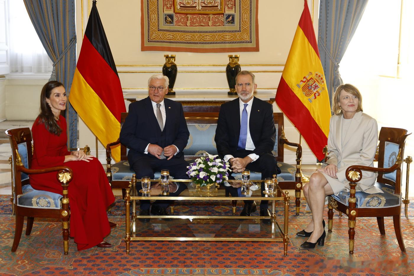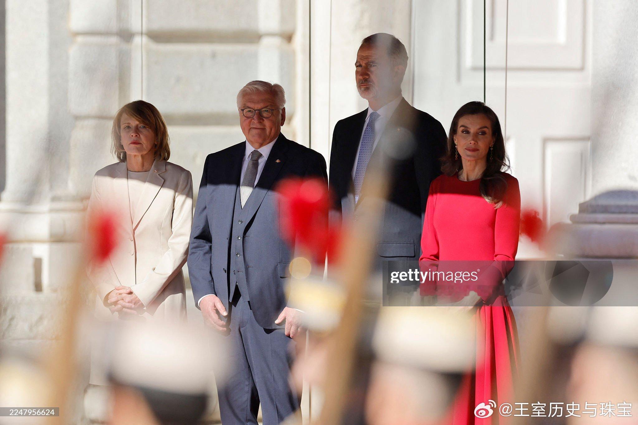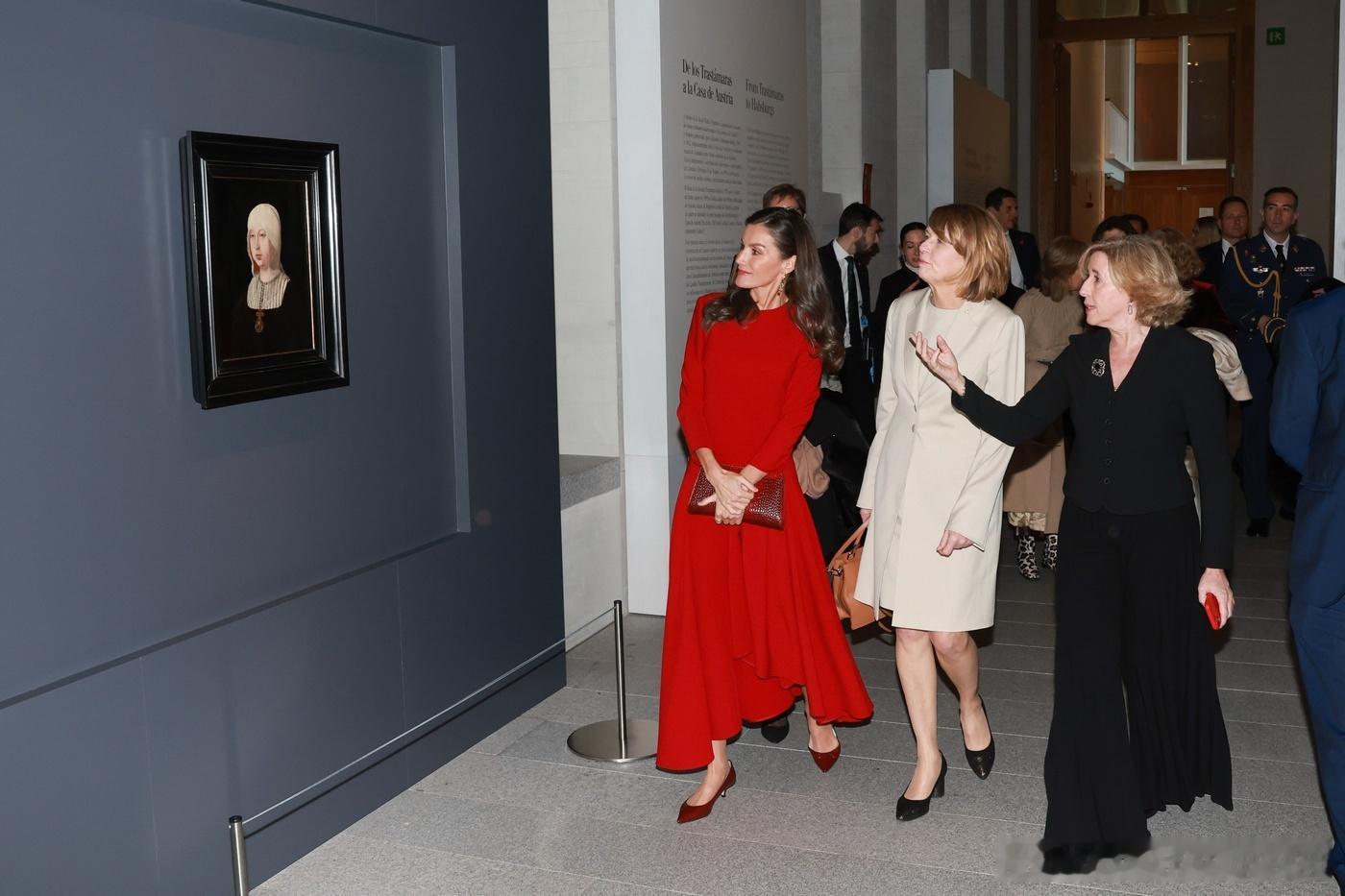 新闻 2025.11.26 德国国事访问西班牙Day 1,是2022年西班牙国事访问德国的回请访问,西班牙国王夫妇在马德里皇宫举行欢迎仪式,随后西班牙王后莱蒂齐亚和德国总统夫人埃尔克·比登本德一同出席由德国驻西班牙大使馆组织关于西班牙妇女和性别平等的工作会议。小莱的黑色斗篷来自Carolina Herrera,新红裙来自The 2nd Skin CO.(这牌子不便宜但买的还不少),
