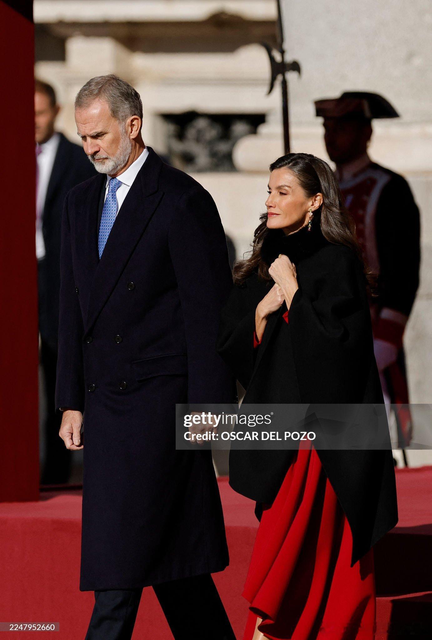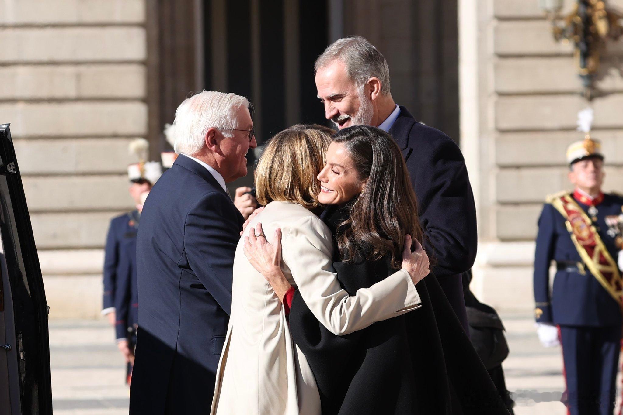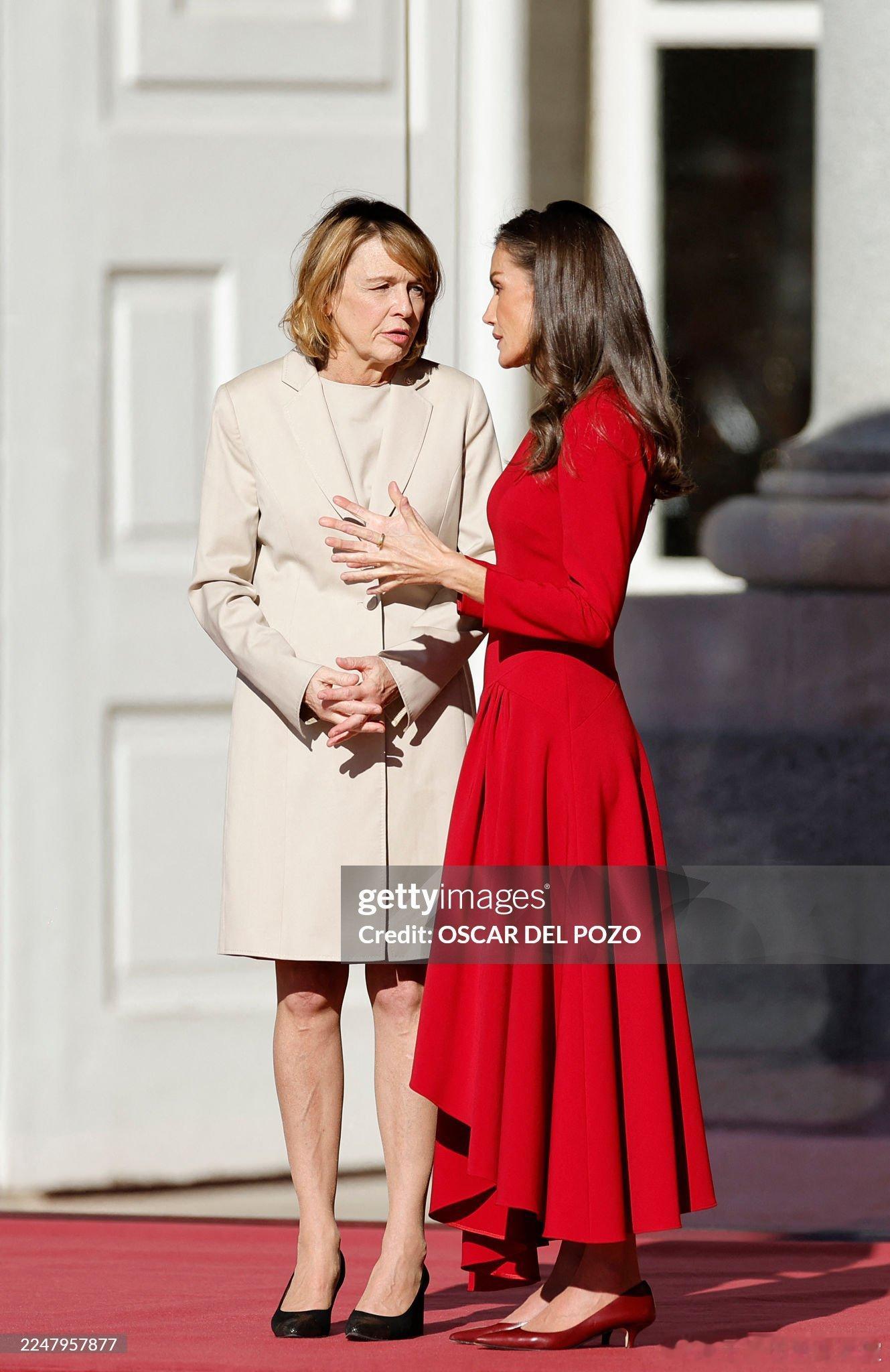 新闻 2025.11.26 德国国事访问西班牙Day 1,是2022年西班牙国事访问德国的回请访问,西班牙国王夫妇在马德里皇宫举行欢迎仪式,随后西班牙王后莱蒂齐亚和德国总统夫人埃尔克·比登本德一同出席由德国驻西班牙大使馆组织关于西班牙妇女和性别平等的工作会议。小莱的黑色斗篷来自Carolina Herrera,新红裙来自The 2nd Skin CO.(这牌子不便宜但买的还不少),
