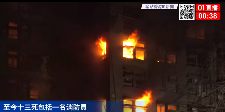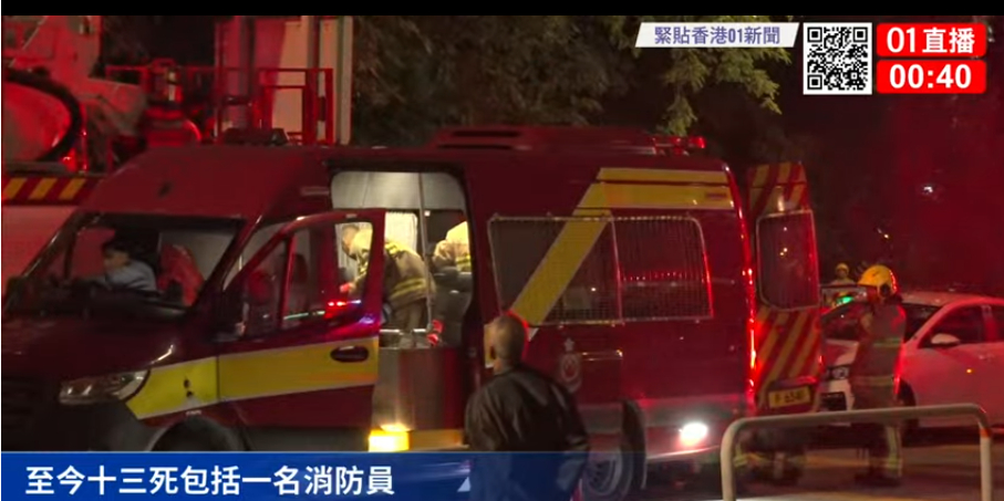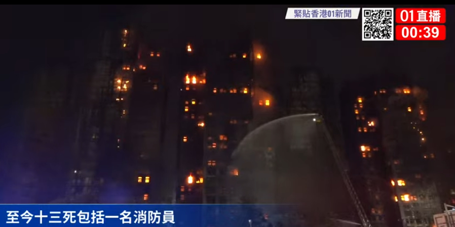 🔻香港媒体 HK01 此前的直播画面。🔻可以看到火势目前集中在楼体内部。香港启动应急救援机制香港已出动超1000人灭火热点现场