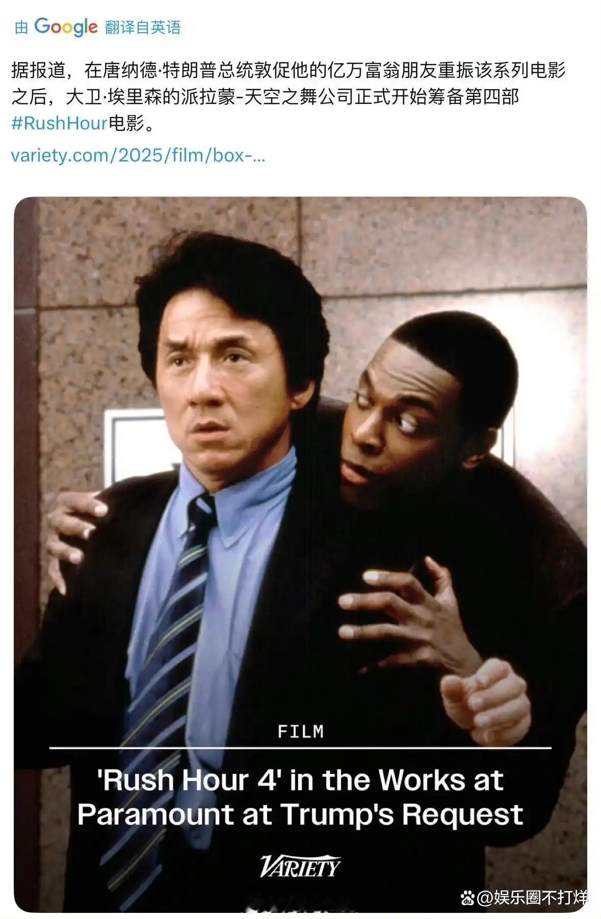 好家伙! 2025年11月26日,特朗普推动《尖峰时刻4》 家人们,特朗普又搞大事情啦!2025年11月26日消息,特朗普施压派拉蒙拍《尖峰时刻4》。这电影系列可是不少人的童年回忆,成龙和克里斯·塔克搭档,一个能打一个能说,美式幽默和中式功夫的组合,当年可是火遍全球 。 可这都过去多少年啦,现在重启,是真要搞情怀?成龙都71岁了,克里斯·塔克也淡出大众视野很久,真拍的话,动作戏还能像以前那么精彩吗?有网友吐槽这简直是“政治任务”,特朗普是不是想借着好莱坞的影响力,搞他那一套文化主张 ? 而且派拉蒙据说醉翁之意不在酒,拿这事儿当幌子,实际想收购华纳资产。这娱乐圈和政治、资本搅和在一起,简直比电影剧情还精彩!这《尖峰时刻4》到底能不能拍出来,拍出来又会是啥样,真让人好奇。 特朗普 尖峰时刻