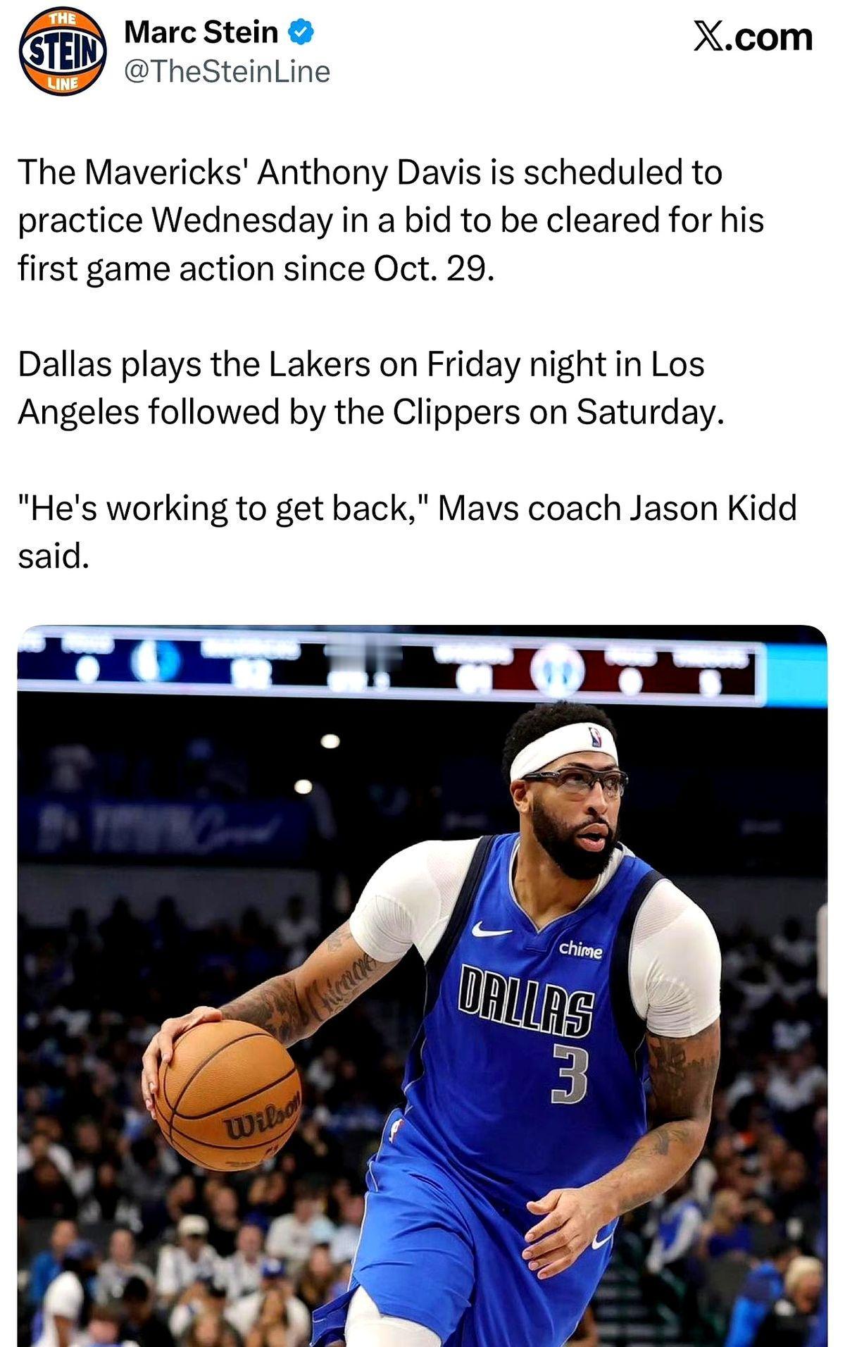 浓眉哥要回来了,第一场就硬刚独行侠! 安东尼·戴维斯自10月29日伤了后,歇了足足17场,湖人这段时间9胜8负,不上不下的。他场均24.3分10.2个板,没了他,湖人内线就空了。周五他要是真能上场,湖人的防守和篮板就有救了。 可对手是状态火热的独行侠,过去10场赢了7场,东契奇那数据奔着场均三双(28+9+9)去了。独行侠主帅基德早就放话,专门练了怎么防戴维斯。人家还是背靠背作战,体能是个问题,就看湖人能不能抓住机会。 这节骨眼上,韦德又聊起了乔丹和詹姆斯谁是历史最佳。他说乔丹是电视上的神,詹姆斯是他亲眼见过的最强。那GOAT的争论,就没停过就没停过。 这场球对西部排名影响不小,湖人赢了就能稳住前六,输了可能就危险了。戴维斯复出第一战,就是检验成色的时候。