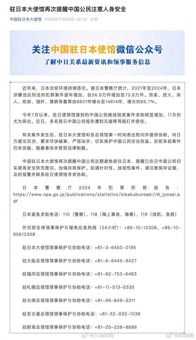 【注意!#我驻日使馆再次提醒注意人身安全#】#再次提醒近期避免前往日本#近年来,日本治安环境持续恶化。今年7月以来,驻日使领馆接到的中国公民被歧视类案件求助明显增加,11月份尤为突出。近日,多名旅日中国公民报告遭到无端辱骂殴打并受伤。有关案件发生后,驻日本大使馆和各总领馆第一时间表达慰问并提供协助,向日方提出交涉,要求尽快破案,严惩凶手,切实保护中国公民合法权益。目前多起案件仍未侦破,施暴者尚未受到法律制裁。中国驻日本大使馆再次提醒中国公民近期避免前往日本,提醒已在日中国公民切实提高安全防范意识,加强自我保护。如遇针对性、歧视性案件,请注意保存证据,及时报警并联系驻日使领馆寻求协助。日本紧急求助电话:110(警察)、118(海上事故、海难)、119(消防、急救)外交部全球领事保护与服务应急热线(24小时):+86-10-12308,+86-10-65612308驻日本大使馆领事保护与协助电话:+81-3-6450-2195驻大阪总领馆领事保护与协助电话:+81-6-6445-9427驻福冈总领馆领事保护与协助电话:+81-92-753-6483驻札幌总领馆领事保护与协助电话:+81-11-513-5335驻长崎总领馆领事保护与协助电话:+81-95-849-3311驻名古屋总领馆领事保护与协助电话:+81-52-932-1036 驻新潟总领馆领事保护与协助电话:+81-25-228-8888 网页链接 (人民日报)
