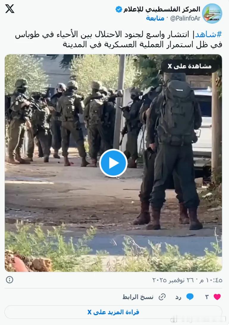以色列军队在图巴斯拘留45名巴勒斯坦人 据图巴斯囚犯俱乐部负责人称,被占领军在图巴斯、亚喀巴和塔蒙镇以及塔亚西尔村拘留的巴勒斯坦人人数已上升至45人。 他报告说,占领军士兵破坏了居民的财产并损坏了供水管道。图1 翻译:在图巴斯市持续进行的军事行动中,占领军广泛部署于该市各社区。