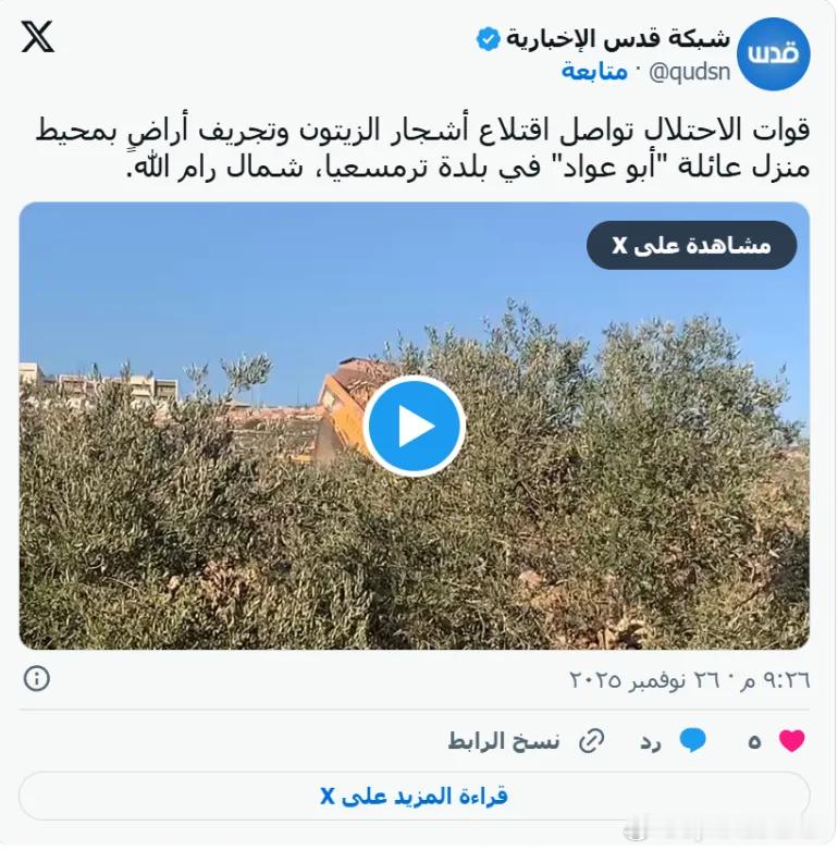 以色列军队在拉马拉以北的图尔穆斯·阿亚镇推平土地 巴勒斯坦媒体报道称,以色列军队在拉马拉以北的图尔穆斯·阿亚镇拔除橄榄树并推平土地。图1 翻译:占领军继续在拉马拉以北的图尔穆斯阿亚镇“阿布·阿瓦德”家族的房屋周围拔除橄榄树并推平土地。