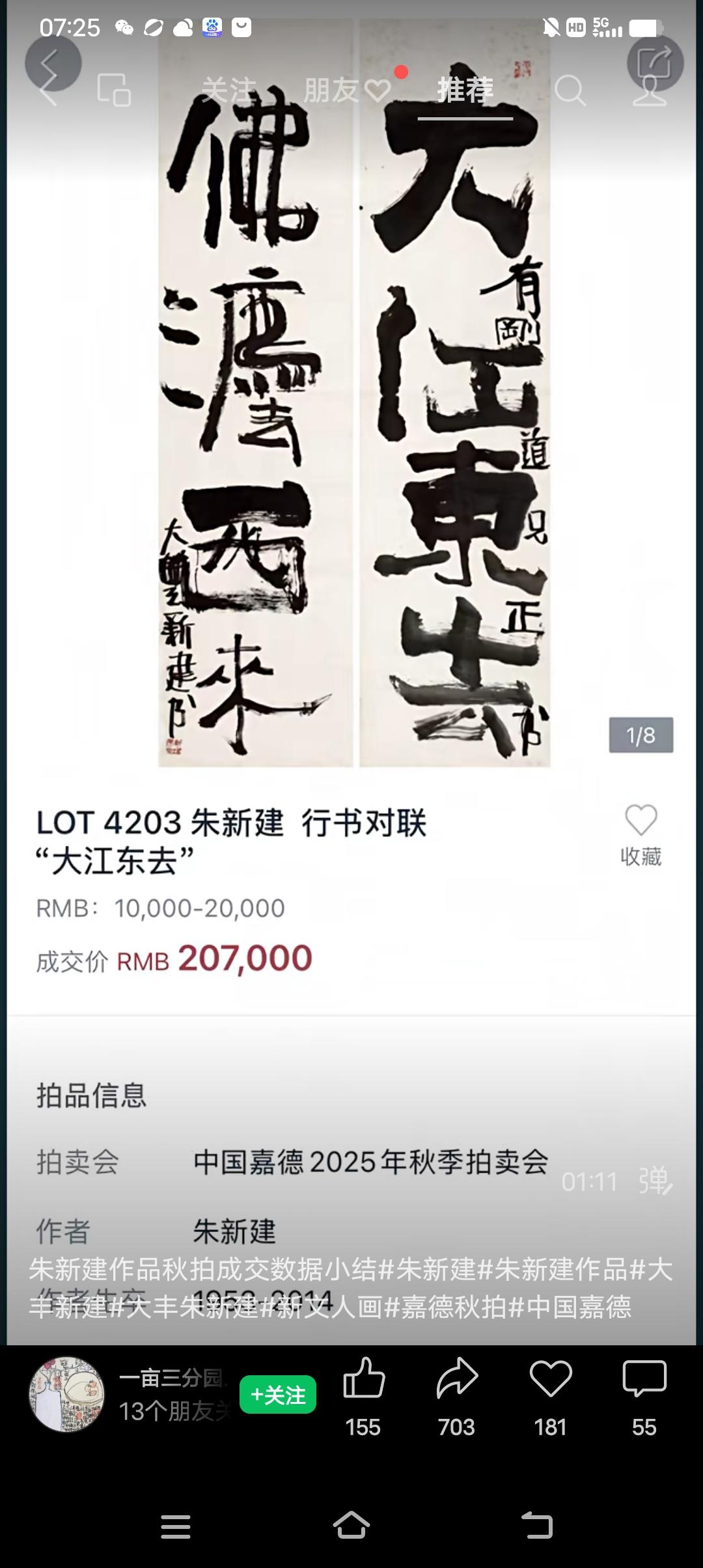 2025嘉德秋拍朱新建作品全部成交,值得关注的是有一幅对联,朱新建教授写给临沂花鸟画家王有刚老兄的,也拍出了二十多万的高价,值得祝贺。欢迎大家留言文明交流!