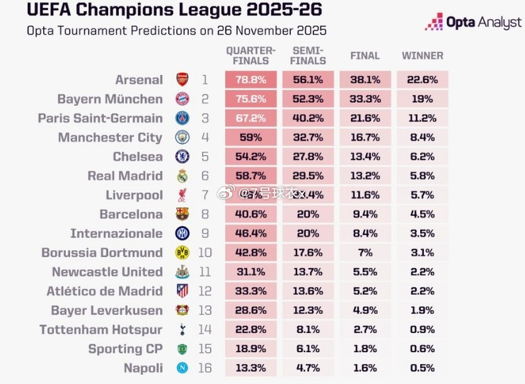 本轮欧冠战罢,数据网站OPTA也更新了本赛季欧冠夺冠概率,其中阿森纳最被看好,具体夺冠概率如下:1、阿森纳 22.6%2、拜仁 19%3、巴黎 11.2%4、曼城 8.4%5、切尔西 6.2%6、皇马 5.8%7、利物浦 5.7%8、巴萨 4.5%9、国米 3.5%10、多特 3.1%11、纽卡 2.2%12、马竞 2.2%13、勒沃库森 1.9%14、热刺 0.9%15、葡体 0.6%16、那不勒斯 0.5%