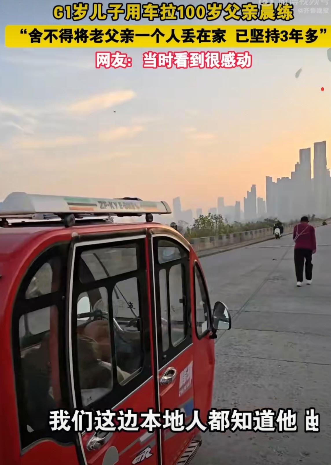 61岁儿子拉车带百岁父亲晨练三年 孝心暖人心 11月25日,安徽蚌埠一段“61岁儿子用车拉100岁老父亲晨练”的视频在网络走红,引发网友广泛热议与点赞。画面中,白发苍苍的儿子推着特制的简易小车,百岁老父亲坐在车上,身披外套、面带笑容,父子二人沿着路边缓缓前行,成为清晨街头一道温情的风景线。 据当事人介绍,老父亲年逾百岁,行动不便但精神矍铄,自己今年也已61岁,退休后便全身心照料父亲起居。因舍不得将老人独自留在家中,又希望父亲能多接触户外、活动筋骨,三年多前他特意改造了一辆轻便小车,每天清晨准时带着父亲出门晨练,沿途欣赏风景、聊聊家常,单程路程约2公里,风雨无阻从未间断。 三年来,这份跨越甲子的陪伴不仅让老父亲保持着良好的精神状态,更诠释了“你养我长大,我陪你变老”的传统孝道。网友纷纷留言:“最动人的孝心莫过于长久的陪伴”“这才是平凡生活中最珍贵的幸福”,这份质朴而坚定的亲情,为社会传递了温暖向善的正能量
