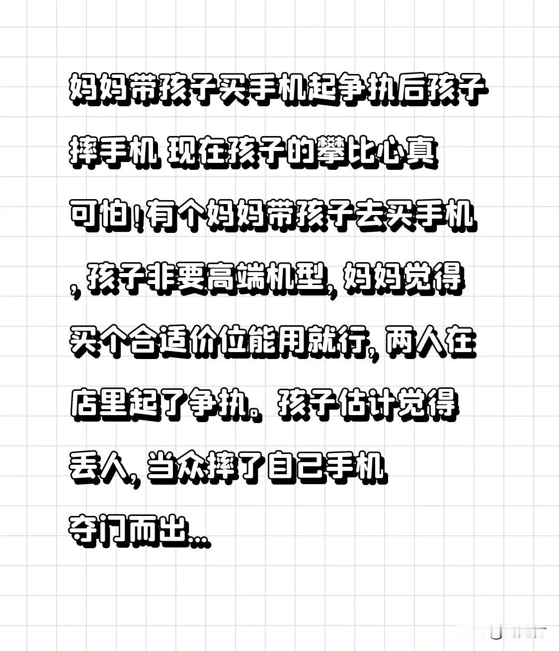 妈妈带孩子买手机起争执后孩子摔手机 妈妈带孩子买手机起争执,孩子怒摔手机,如今孩子的攀比心着实可怕!一位妈妈带孩子去买手机,孩子执意要买高端机型,妈妈认为买个价格合适、能正常使用的就行,两人在店内起了争执。孩子或许觉得丢脸,当众摔了自己的手机后夺门而出。 从妈妈的穿着能看出,家里条件并不宽裕。孩子摔完手机离开后,妈妈默默跟在后面捡起摔坏的手机。这大概率是惯养孩子所致,孩子在家习惯了说一不二,一旦不被满足就撒泼耍赖。有本事就自己挣钱买,花着父母的钱还要求苛刻,实在不该。“惯子如杀子”,家长们真该好好反思了。 小孩玩妈妈手机