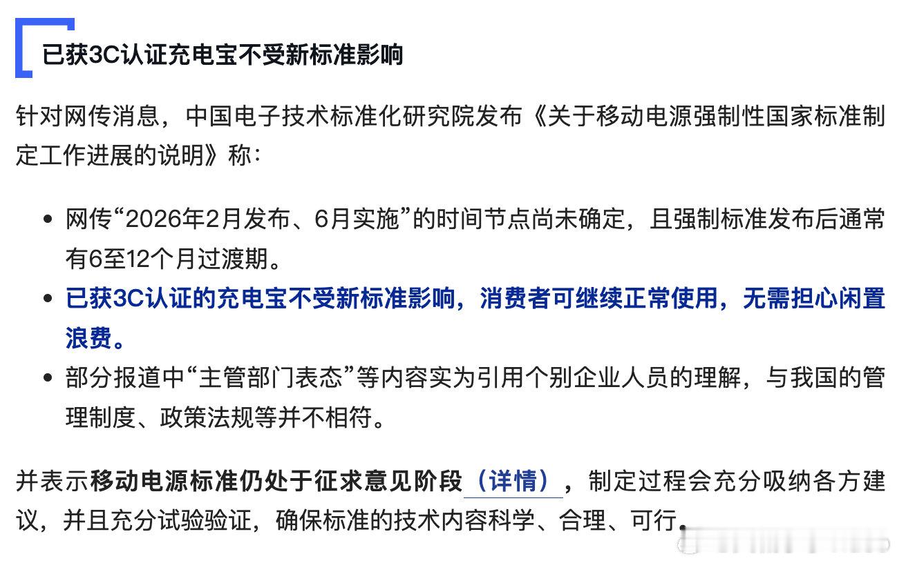 【已获3C认证充电宝无需担心闲置】已获3C认证充电宝可继续使用 近日,网传“充电宝安全新标准曝光,3C认证全面失效”,部分内容引发网友担心:刚买的3C充电宝,是不是要闲置浪费了?还能携带登机吗?针对网传消息,中国电子技术标准化研究院发布《关于移动电源强制性国家标准制定工作进展的说明》称:网传“2026年2月发布、6月实施”的时间节点尚未确定,且强制标准发布后通常有6至12个月过渡期。已获3C认证的充电宝不受新标准影响,消费者可继续正常使用,无需担心闲置浪费。部分报道中“主管部门表态”等内容实为引用个别企业人员的理解,与我国的管理制度、政策法规等并不相符。并表示,移动电源标准仍处于征求意见阶段(详情),制定过程会充分吸纳各方建议,并且充分试验验证,确保标准的技术内容科学、合理、可行。 (央视新闻)