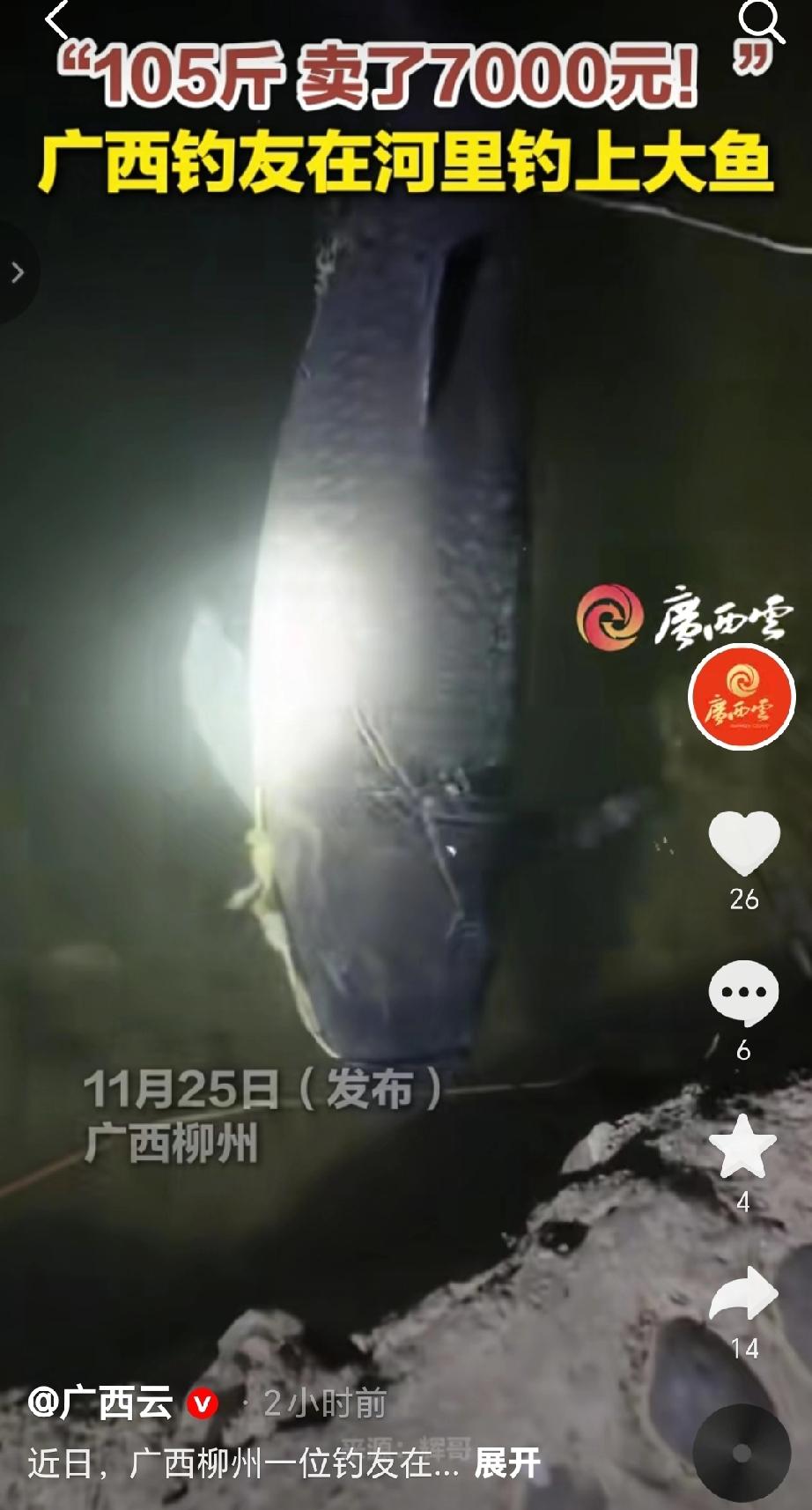 近日广西柳州的一位钓友在河里钓到一条大的清鱼,有猪仔那么大了。后这条鱼重105斤,最终以7000元的价格卖出,现在这么大的雨还是比较少见的。