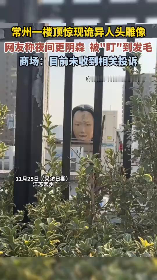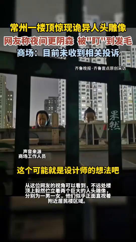 常州一楼顶惊现诡异人头雕像,网友称夜间更阴森被"盯"到发毛。商场:目前未收到相关投诉。 齐鲁晚报·齐鲁壹点原创采访。 11月25日(采访日期),江苏常州。近日,有网友发视频称,自己在常州某分别为一男一女,他们似乎正面直视着让人感到不适。从这位网友的视角可以看到,不远处楼顶上毅然伫立着两个巨大的人头雕像。 声音来源:商场工作人员。 这个可能就是设计师的想法吧?这个具体我们不太清楚。商场开了快十年了。11月25日,记者就此事咨询九洲新世界广场工作人员表示,这两个雕像是当时商场开业时候的设计,已经存在了十年。"可能是当时设计师的想法吧,当初的设计就是这样的,具体代表什么我们也不太清楚,反正是一直在的。"针对网友反映的观感问题,该工作人员称,目前暂未收到相关投诉。
