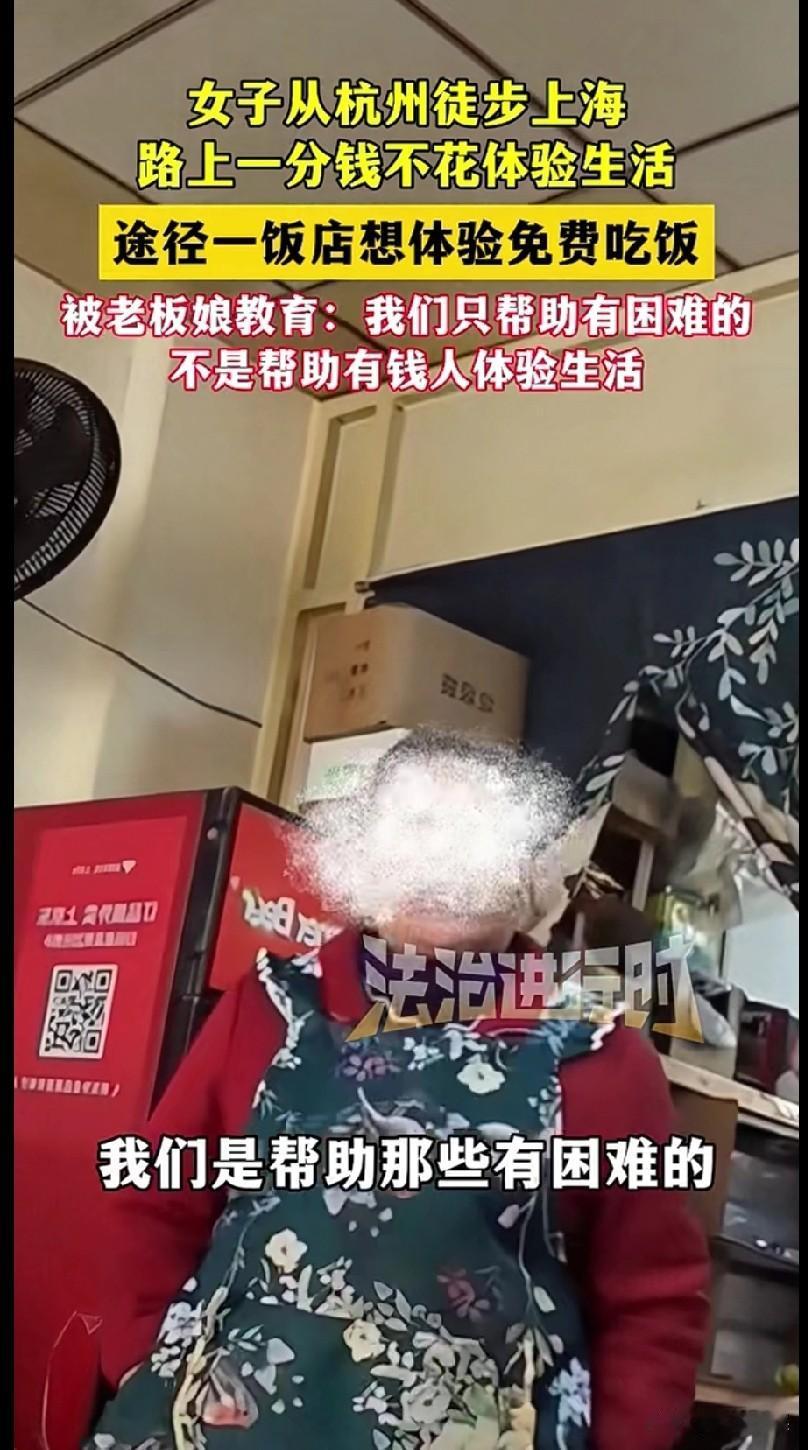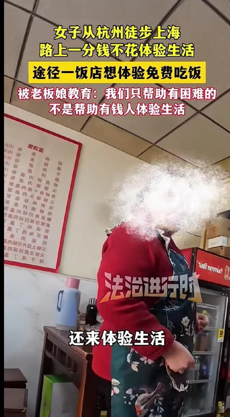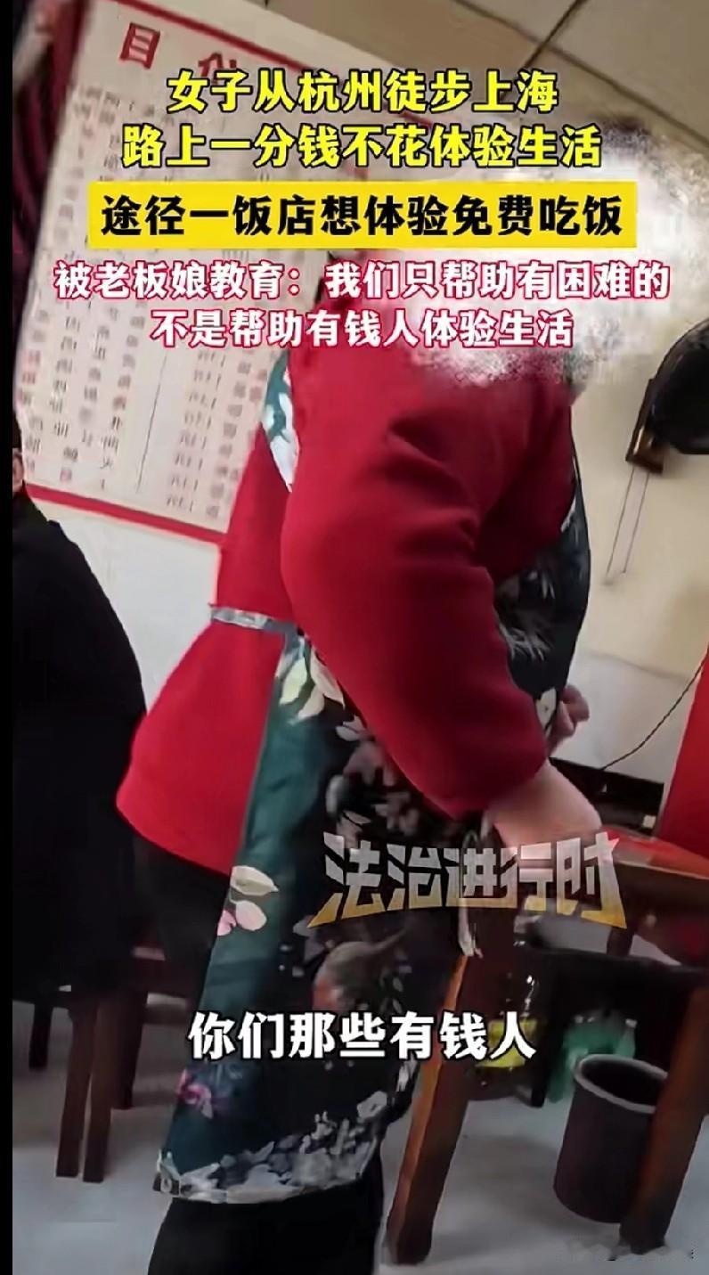 挑战不花自己的钱,花别人的钱! 女子从杭州徒步到上海,体验路上不花一分钱的生活。在路上女子追上一位女孩,说道:小美女,你好,我是徒步从杭州到上海的,然后这一路上所有吃和住的问题,都得自己解决,自己是不能花一分钱的,我能请你帮忙吗?女孩干脆利落回答了她:不能! 女子又到了一家小饭店,也是请求帮忙,没想到被老板娘教育了一番,老板娘气愤的说:我们只帮助有困难的人,不是帮助有钱人体验生活的。你们有钱人体验生活,一顿饭钱都舍不得给吗? 此事引起了网友的热议。 有的网友说:倒反天罡啊!不是有应该有钱帮助没钱的么?现在是没钱的帮助有钱的!还挑战不花钱?你怎么不挑战“走一路撒一路钱呢”,这样第二天你就会火。 也有的网友说:你体验生活,别人都该你的啊? 其实我觉得你想一分钱不花体验生活,也不是没有办法,你可以一路打工过去啊,你去饭店想吃一顿饭,你可以先跟店老板说我帮你干半天活,报酬是一顿饭可以吗。而不是上来就很有理的说,你要不花钱吃饭,让老板帮你。店老板会这样骂你?你还搁那说不要紧不要紧,谢谢谢谢。咋滴,被骂还委屈啊。是你要体验生活艰辛,还是你让别人体验生活艰辛啊?