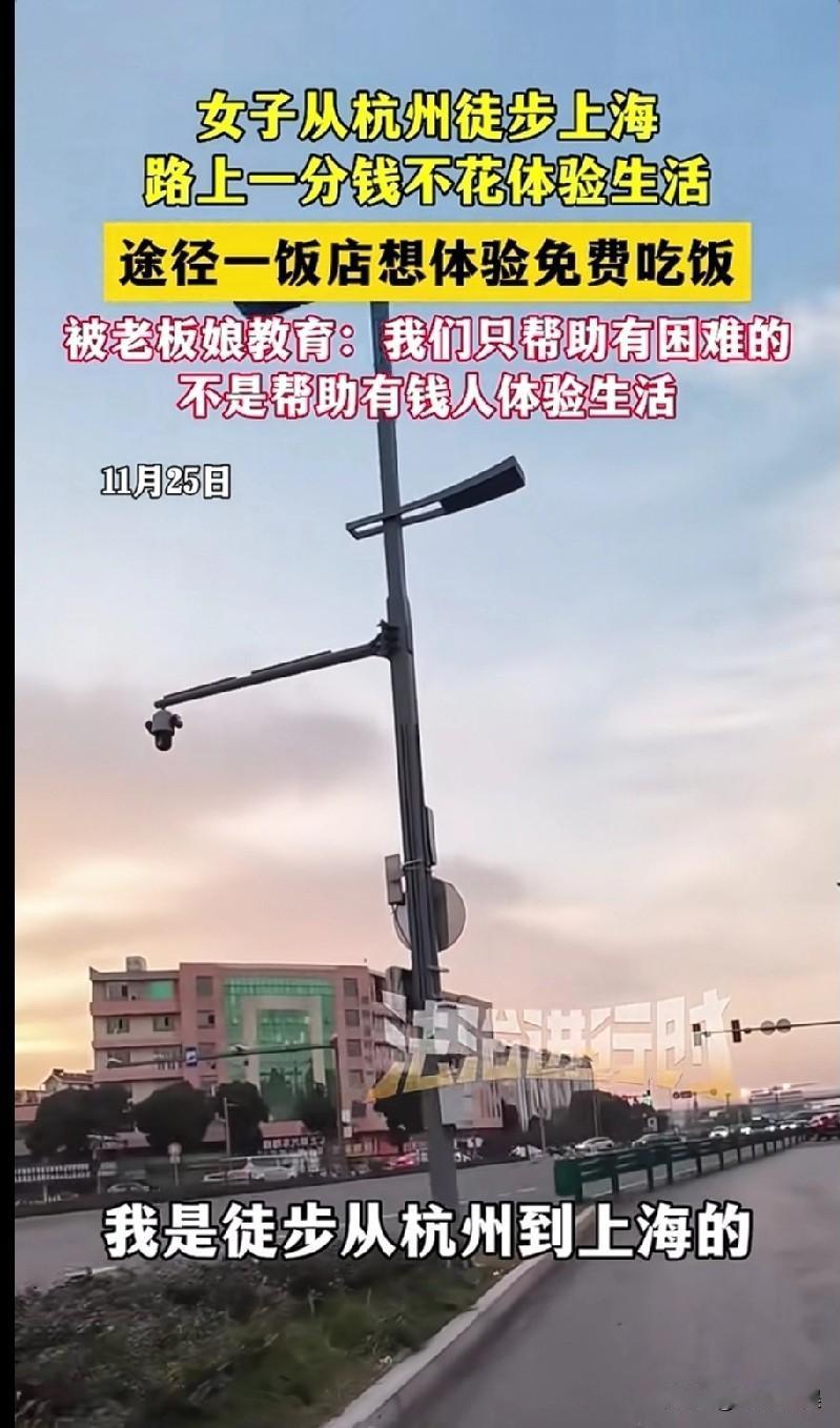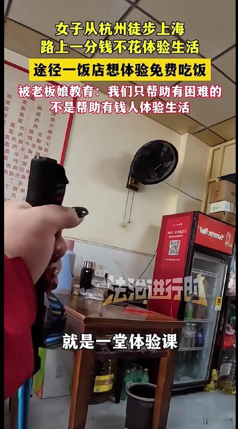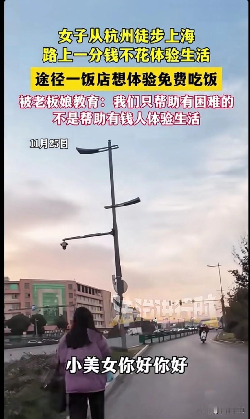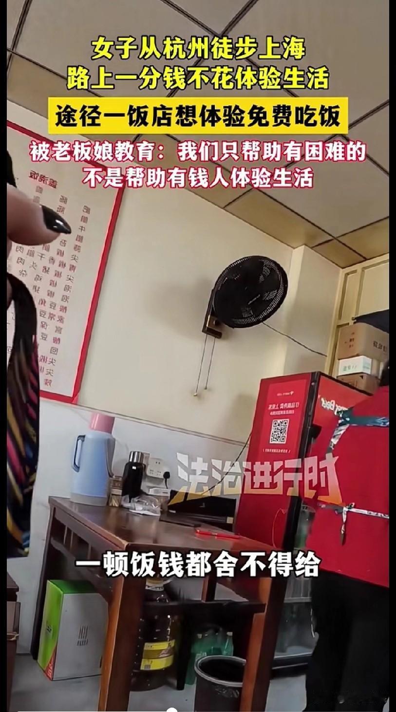 挑战不花自己的钱,花别人的钱! 女子从杭州徒步到上海,体验路上不花一分钱的生活。在路上女子追上一位女孩,说道:小美女,你好,我是徒步从杭州到上海的,然后这一路上所有吃和住的问题,都得自己解决,自己是不能花一分钱的,我能请你帮忙吗?女孩干脆利落回答了她:不能! 女子又到了一家小饭店,也是请求帮忙,没想到被老板娘教育了一番,老板娘气愤的说:我们只帮助有困难的人,不是帮助有钱人体验生活的。你们有钱人体验生活,一顿饭钱都舍不得给吗? 此事引起了网友的热议。 有的网友说:倒反天罡啊!不是有应该有钱帮助没钱的么?现在是没钱的帮助有钱的!还挑战不花钱?你怎么不挑战“走一路撒一路钱呢”,这样第二天你就会火。 也有的网友说:你体验生活,别人都该你的啊? 其实我觉得你想一分钱不花体验生活,也不是没有办法,你可以一路打工过去啊,你去饭店想吃一顿饭,你可以先跟店老板说我帮你干半天活,报酬是一顿饭可以吗。而不是上来就很有理的说,你要不花钱吃饭,让老板帮你。店老板会这样骂你?你还搁那说不要紧不要紧,谢谢谢谢。咋滴,被骂还委屈啊。是你要体验生活艰辛,还是你让别人体验生活艰辛啊?