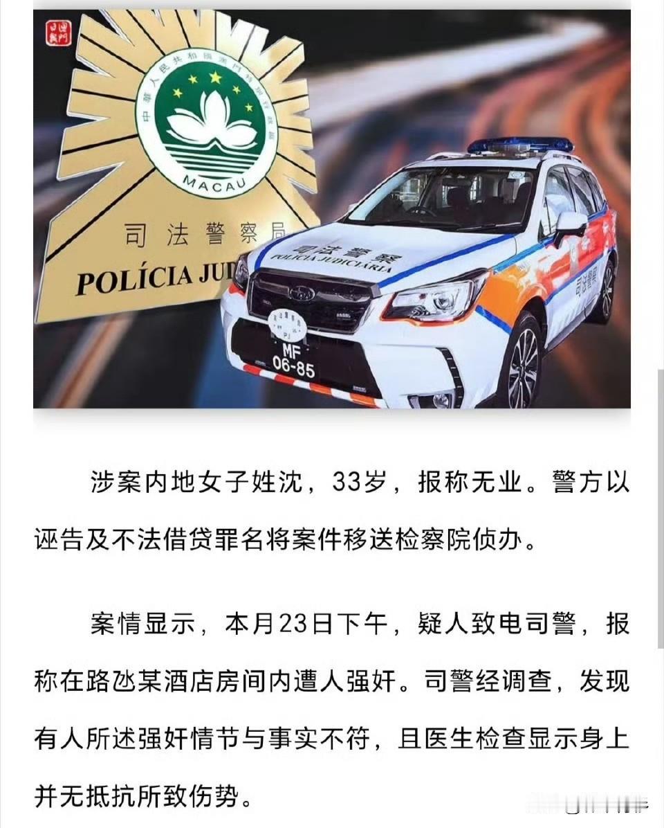 女子为追讨债款,竟诬告对方强奸,企图利用警力寻找债主,最后被警方拘捕! 消息来源:澳门日报 11月26日据澳门日报报道,23日内地一名33岁沈姓女子,报警称在澳门某酒店内遭人强奸,但经警方调查发现女子所述强奸情节与事实严重不符,且未在她身上发现任何伤势! 26日澳门警方透露案件具体细节: 偷鸡不成蚀把米! 沈姓女子于20日在某赌场内结识一名内地男子,两人同时参与赌博,在此期间男子输光了沈姓女子4万港币。 20日至22日,沈姓女子又主动出借10万港币供男子赌博,并与男子约定,假如有获利男子将支付2万港币“报酬”,但最终男子还是全部输光! 最后沈姓女子与男子在事发酒店内商谈还款事宜,并签了一份还款协议,期间两人还发生了性关系。 23日沈姓女子由于一直联系不到该名男子,生怕男子跑路,所以选择了报假警,声称自己被强奸,企图利用警察寻找到该名男子! 这应该就是一场“叠码仔”与“赌徒”的荒唐故事,最终的结局:女子钱没了,身子没了,人也进去了! 女子的小伎俩没能逃过澳门警察的双眼,只能说自作自受!