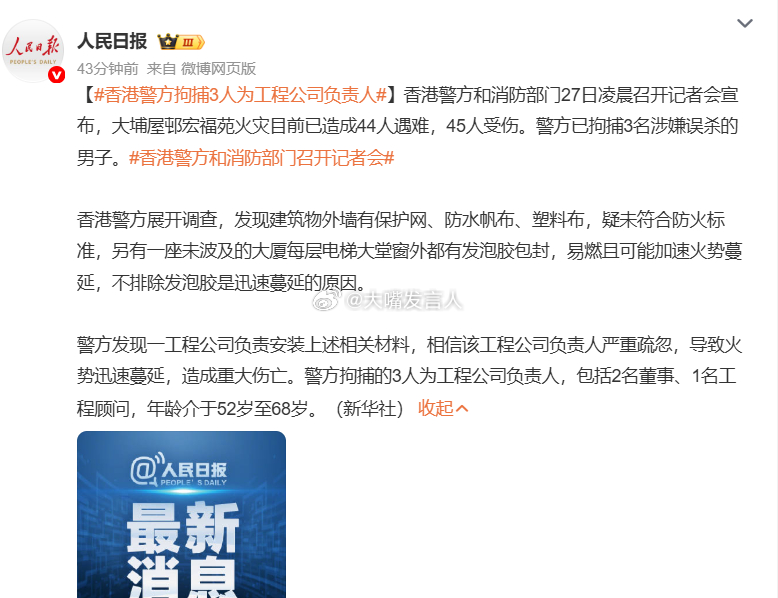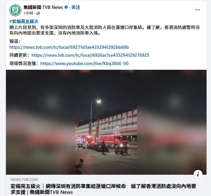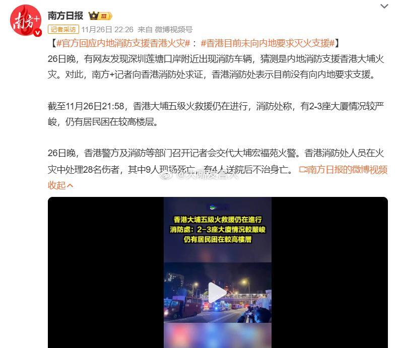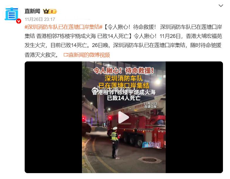 香港目前未向内地要求灭火支援 无线新闻:“网上片段见到,有多架深圳的消防车及大批消防人员在莲塘口岸集结。据了解,香港消防处暂时没有向内地提出要求支援,没有内地消防车入境。”(图1)“香港消防处暂时没有向内地提出要求支援”“26日晚,深圳消防车队已在莲塘口岸集结,随时待命驰援香港灭火救灾。(图4)”深圳消防车队已在莲塘口岸集结,热点观点 ,众星为香港火灾受灾民众祈福,官方回应内地消防支援香港火灾,香港火灾已致44人遇难