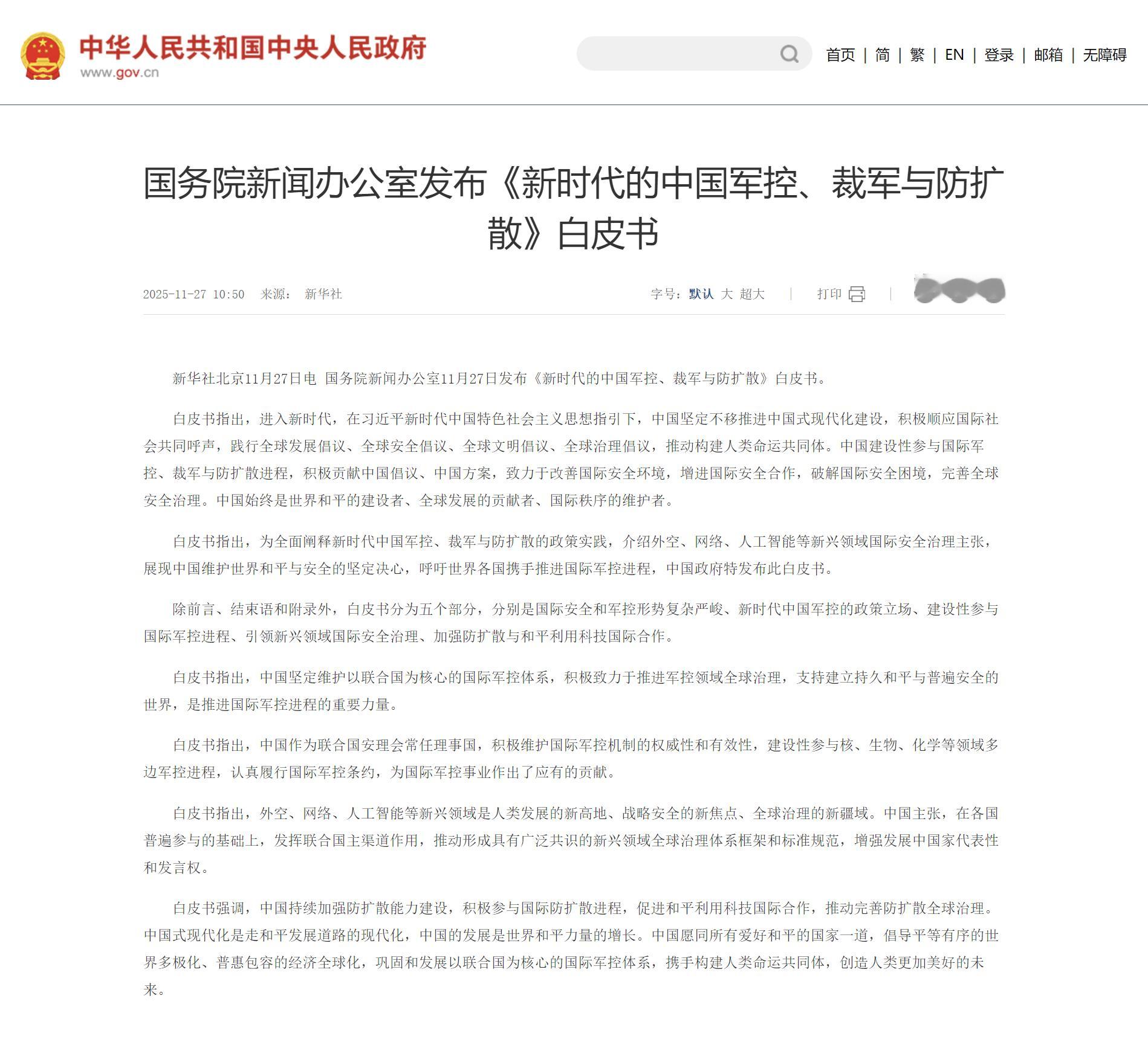 【新时代的中国军控裁军与防扩散白皮书 】国务院新闻办公室11月27日发布《新时代的中国军控、裁军与防扩散》白皮书。白皮书指出,外空、网络、人工智能等新兴领域是人类发展的新高地、战略安全的新焦点、全球治理的新疆域。中国主张,在各国普遍参与的基础上,发挥联合国主渠道作用,推动形成具有广泛共识的新兴领域全球治理体系框架和标准规范,增强发展中国家代表性和发言权。(白皮书全文:新时代的中国军控、裁军与防扩散)