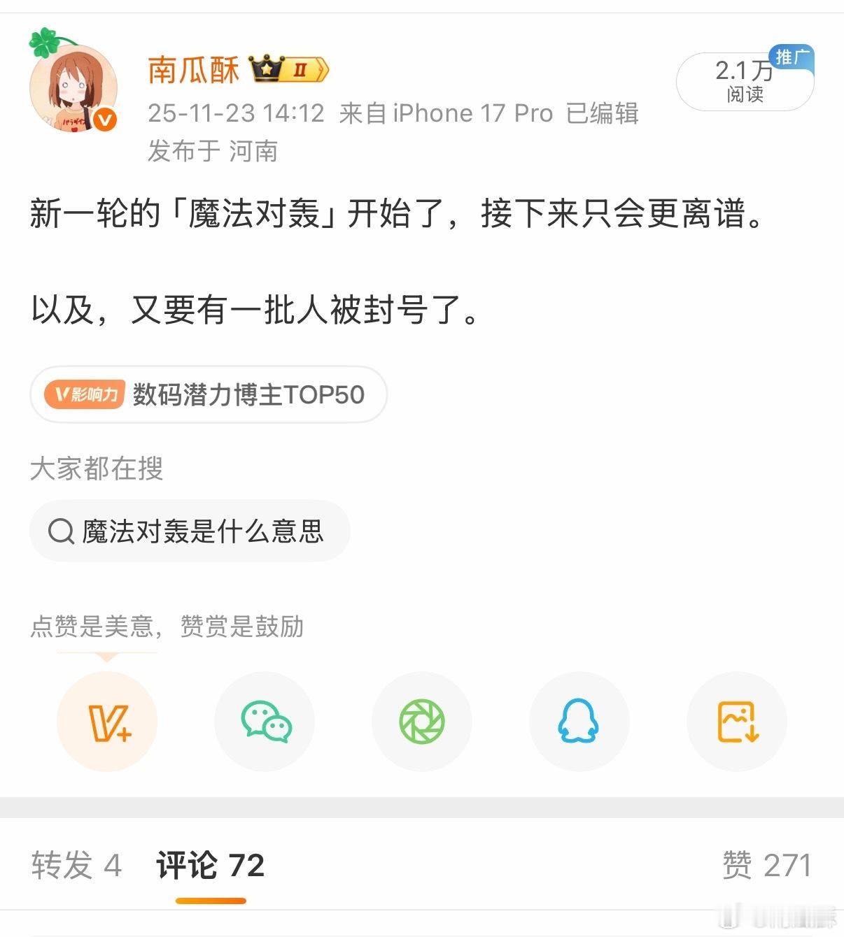 鸿蒙智行发言人开工了。你瓜老师前几天就预感到,新一轮魔法对轰要开始了。两边的魔怔人都太多了,伤害的不只是几家企业,甚至是整个中国科技行业,从手机到汽车,能有多大仇啊,至于打成这样吗大家都谨言慎行吧。乱带节奏被逮住了没好果子吃。
