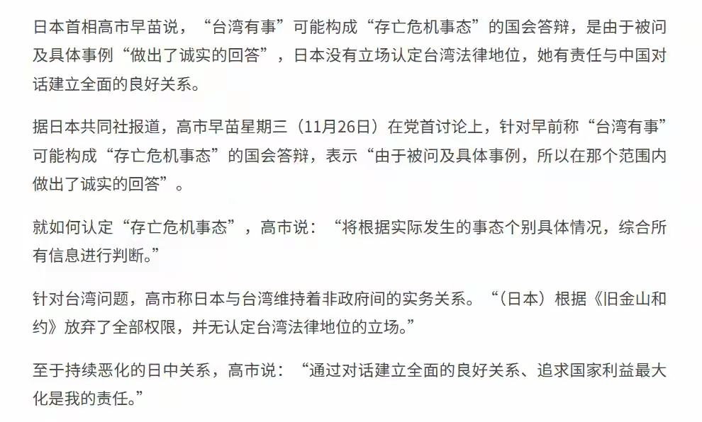 不能被高市早苗忽悠了! 有报道说,11月26日,高市早苗在党首会议上,针对“台湾有事就是日本有事”的谬论,作出解释。 她说,根据《旧金山和约》,日本放弃了全部权限,并无认定台湾地区法律地位的立场,目前仅与台维持着“非政府间的实务关系”。 表面看起来,高市早苗是改口,但是,我们不能被高市早苗的言论忽悠了。因为,在这场会上她还有一句话,就是“在被问及具体事项时,做出了诚实的回答”。 看吧,一句“诚实的回答”暴露了她内心里的真实想法! 可以看出,高市早苗从内里还是极端右翼,典型的日本军国主义思想根深蒂固,只不过是从她嘴里说出来而已。也就是说,是他捅破了那层窗户纸。 由此我们可以知道,日本一直在为军国主义复活,在为日本军事介入我们的统一大业做着准备。因此,我们决不能仅凭高市的一句话就认为她们改变了立场。应该瞅准机会,狠狠地教训一下他们,打服她。 其实,还是石破茂看的明白,“没有与中国的良好关系,你一个日本还能存在下去吗?”