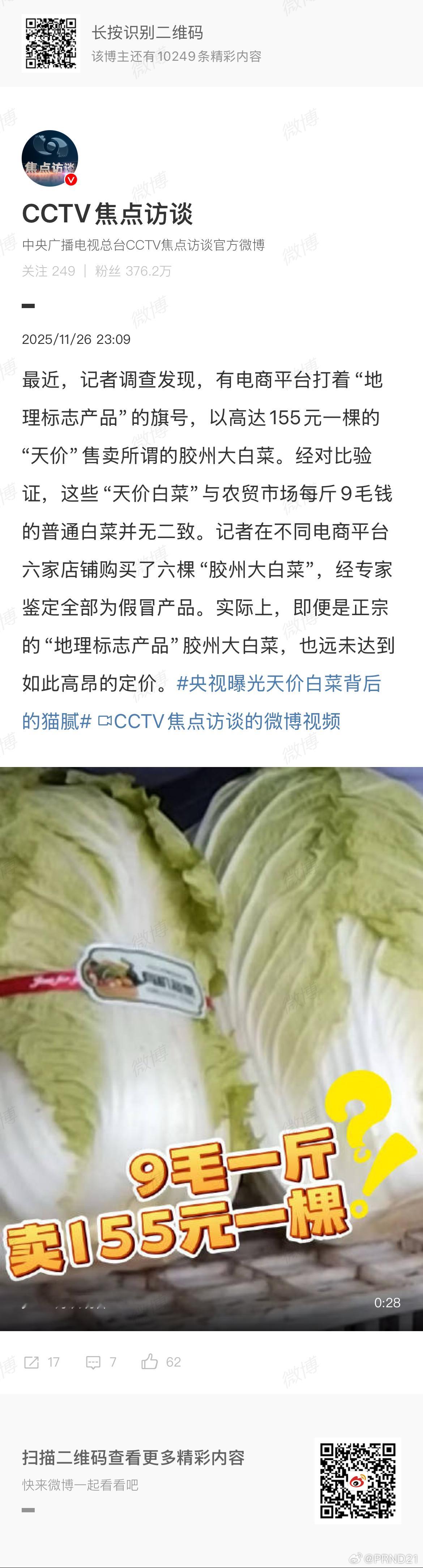 155元天价白菜 普通白菜 无论是不是真的“地理标志产品”,155一颗的白菜我都不会买,再标志它也就是个白菜……都能买一斤半三文鱼了……
